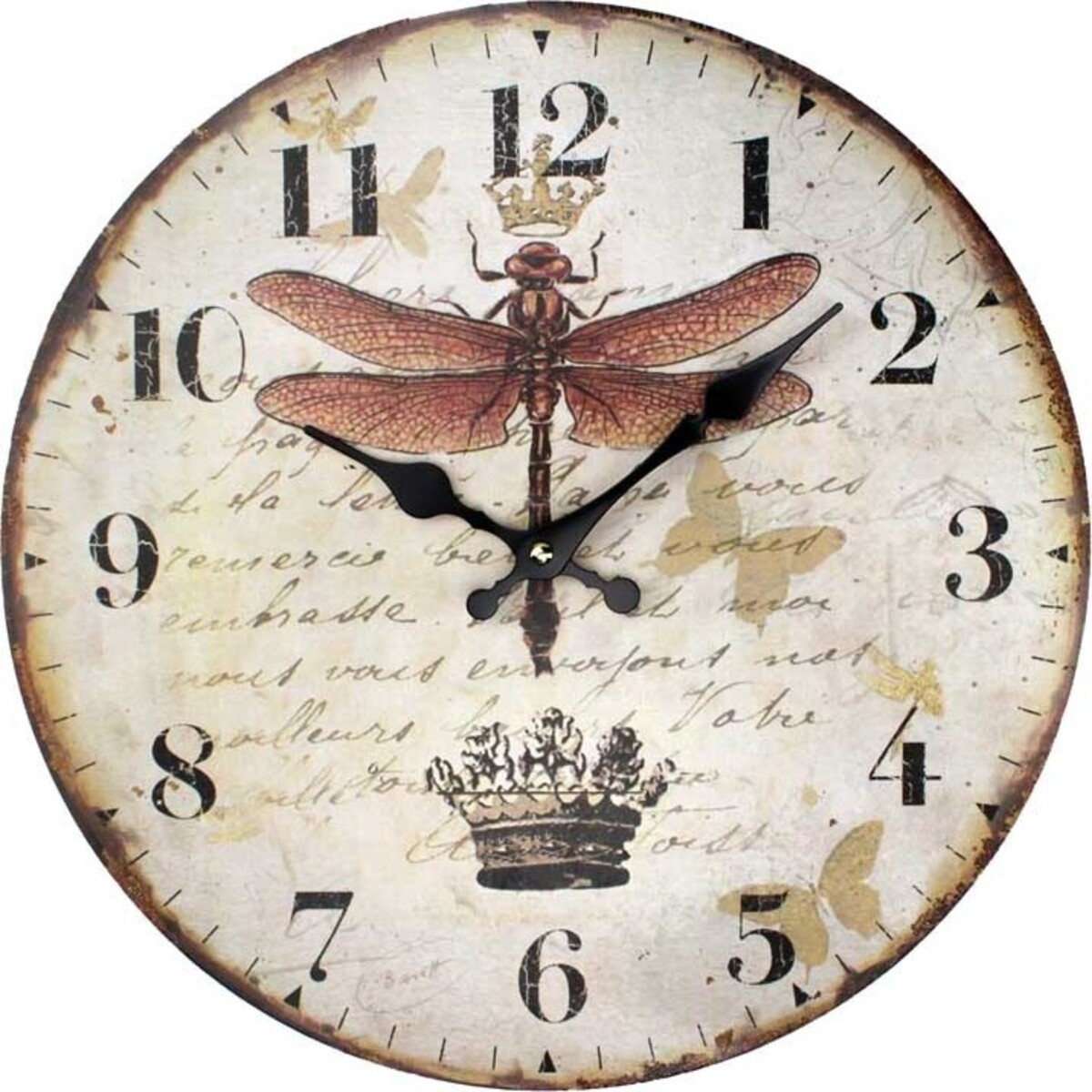 There are a million decorations out there covered in butterflies but perhaps not as many with the less common dragonfly. This dragonfly even has his own crown, as well as there being a second larger crown that could be his chair. The dragonfly crown clock would be a nice present for a gardener that does not want so many flowers and butterflies. However there are a few small butterflies flying around near the back. The clock seems to be printed on top of an antique and handwritten letter. This is a traditional clock in that the two hands go around. What is not so old fashioned is that the clock lies flat against the wall almost as though it were more painting than clock.