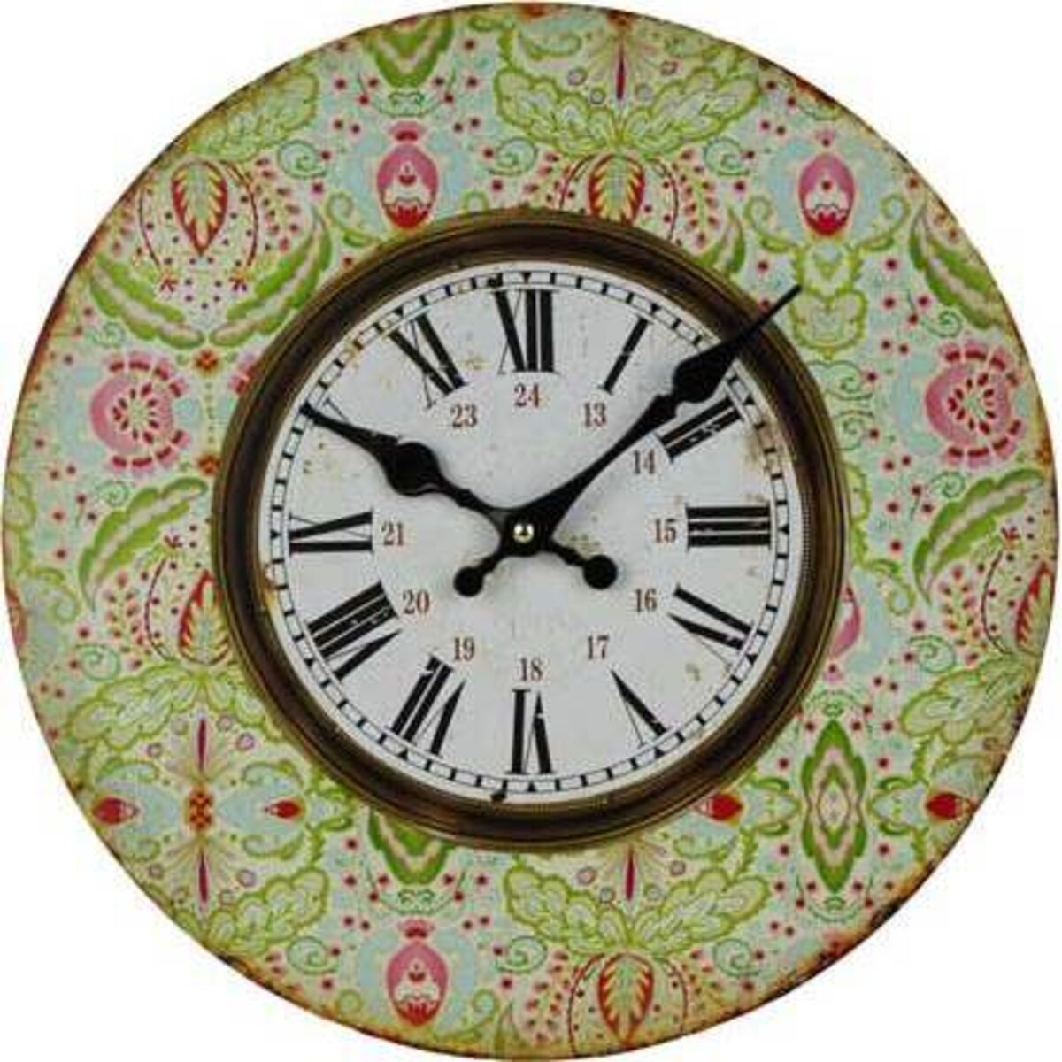 An interesting face to say the least - this clock comes with not just Roman numerals to build in more vintage classic looks but also makes it easier to remember the analog as per hours. For instance the inner circle of the face gives out what hour of the day. What is even more interesting is that the charming bracket which makes up the broad border of the clock - in vintage green white and pink with a dense design that looks delicate and very feminine. This is one of those clocks that will add a great deal of vintage charm to any surrounding. The handsome white clock face is surrounded by a floral design and the hands of the clock is in the typical classic style makes it a great buy for homes or a wonderful present at housewarmings. The clock is altogether is 34 cm in diameter but the real face of the clock is framed within and is more petite.