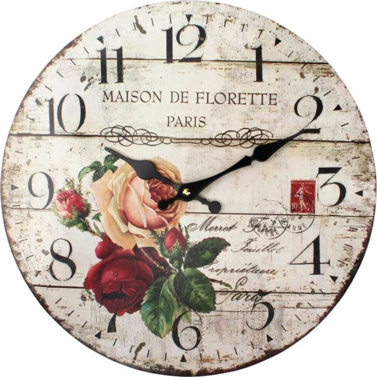 The face of the Florette clock is decorated with a design of roses on a background of weathered wood panels.