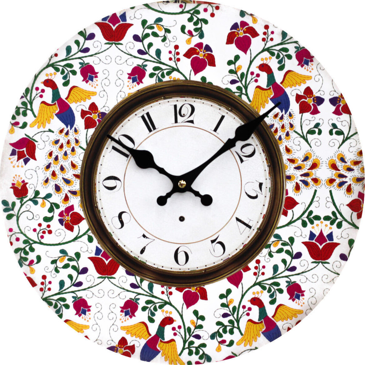 Crafted of medium density fiberboard, it has a 34cm diameter making it medium size in scale and will dramatically fill any empty wall space. The dial of this round wall clock has a rustic brown frame around which colourful peacocks are adorned alongside a variety of natural floral motifs in front of a neat white background creating a warm and inviting atmosphere in any living space. Set this elegant timepiece on the wall of the living room or master suite to add dimension and style to the room vignette. This will add a pop of colour anywhere it is hung and will make a unique housewarming gift.