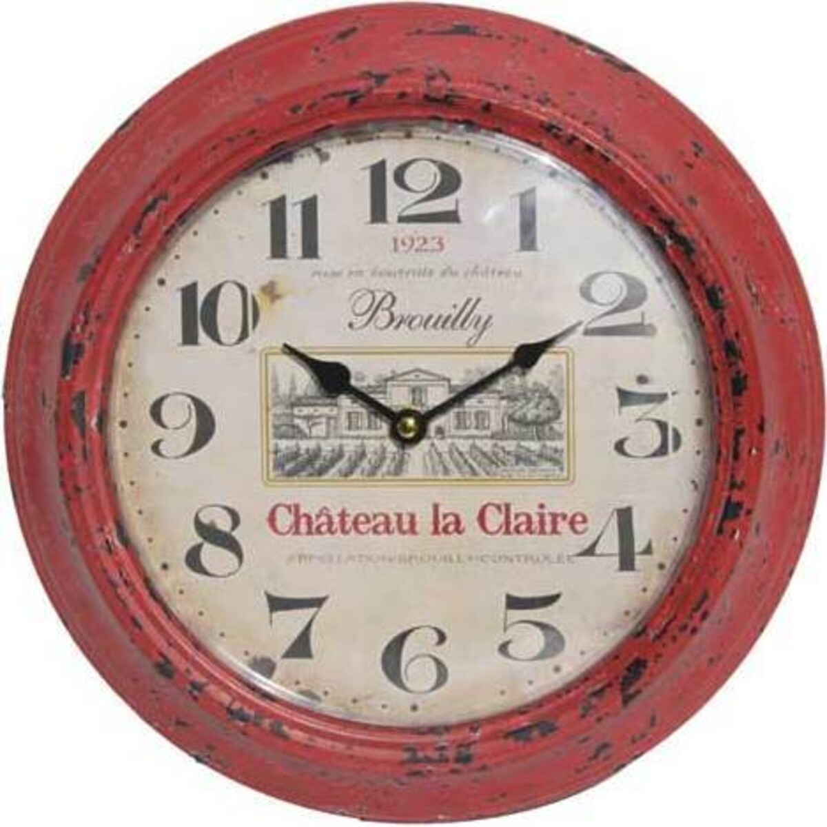 This round red clock features an off-white face that has oversized black numbers, the image of a chateau, and the words "Brouilly" and "Chateau la Claire." The face is slightly darkened to give it an aged appearance, and the border is weathered to give it an extra charming look. It may look like it was purchased right from the shelf of an antique store, but only you'll know where it really came from. Other than its fabulous style, the best part of the clock is the low cost. This clock is certainly going to be a piece you'll love having in your kitchen and looking at every day.