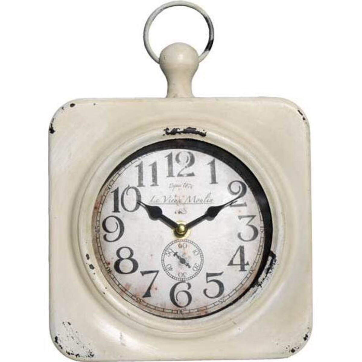 An ordinary clock this is not. This round white clock sits in an off-white square shaped backing that has rounded edges and a loop at the top to make for easy hanging. The hands as well as the numbers are black, so you can easily see them from wherever you are in the room. The entire clock is worn and weathered to give it the image of a vintage piece, and while it may look like a decorative accent from year's past, it certainly doesn't have the price tag to match.