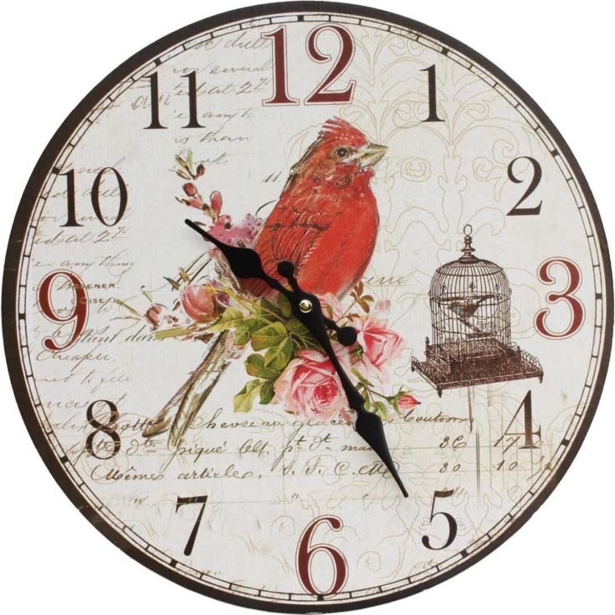 Many people in an earlier time spent their days in pursuit of amateur ornithology or bird watching. Now you can give the bird enthusiast who has everything their very own letter bird clock. The clock is almost looks as though it were imprinted with finely handwritten letter. A scarlet cardinal rests upon the page among the words perched atop a small bouquet of flowers. There are two hands that travel around the center past Western numbers past a bird cage. The clock lies flat against the wall like an unframed picture. In a way it is more of a painting than a timepiece. It is a great way to tell time and brighten up a drab space. The colourful design also looks great leaning on a shelf or on a covered patio.