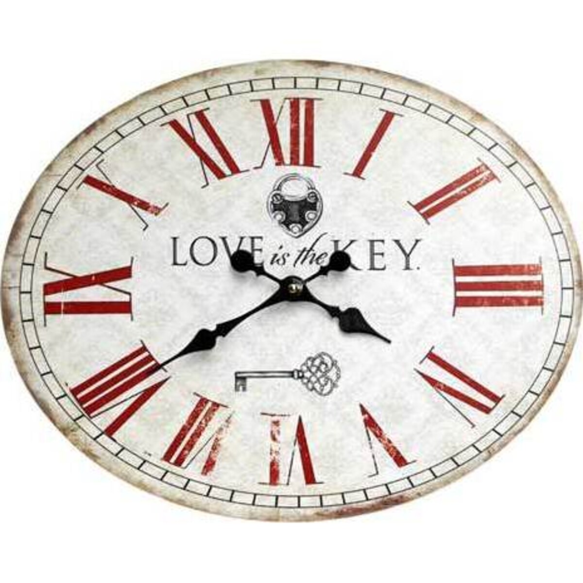 This off-white clock has subtle gray undertones, slight black detailing along the edges, and a black connecting rectangle border along the edge. Bold large red roman numerals and black hands make it easy to always see what time it is regardless of where you are in the room, and at the center is a lovely vintage-inspired black lock and key design along with the quote "Love is Key." The clock not only serves as a much-needed reminder, but is also an exquisite piece of artwork that will add a little extra love wherever in your home you choose to hang it.