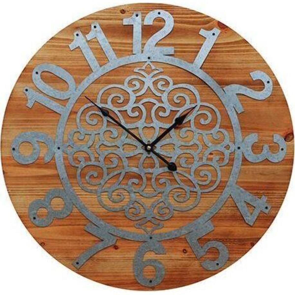 Clocks are almost an imperative in any art of the house or commercial spaces as it makes work much ore convenient and when it comes to placing clocks on wall we have to be conscious of the overall décor direction. This wood and metal combined cock would look especially well suited for classic vintage homes or even in spaces that have a shabby chic décor as it combines an ageing meta frame with numbers and design and placed it atop a wooden clock base. The hands are deep black making visibility clear and sharp. The painted scroll pattern in the center defines the look of the clock and the manner in which the rugged look has been created over and above the ornate design comes from the rivets in black that places the design on the wooden frame. The combination of pastel grey and wood too is quite charming. The clock is 58 cm in diameter making it most suitable for larger walls. Great for bedrooms and living room alike.