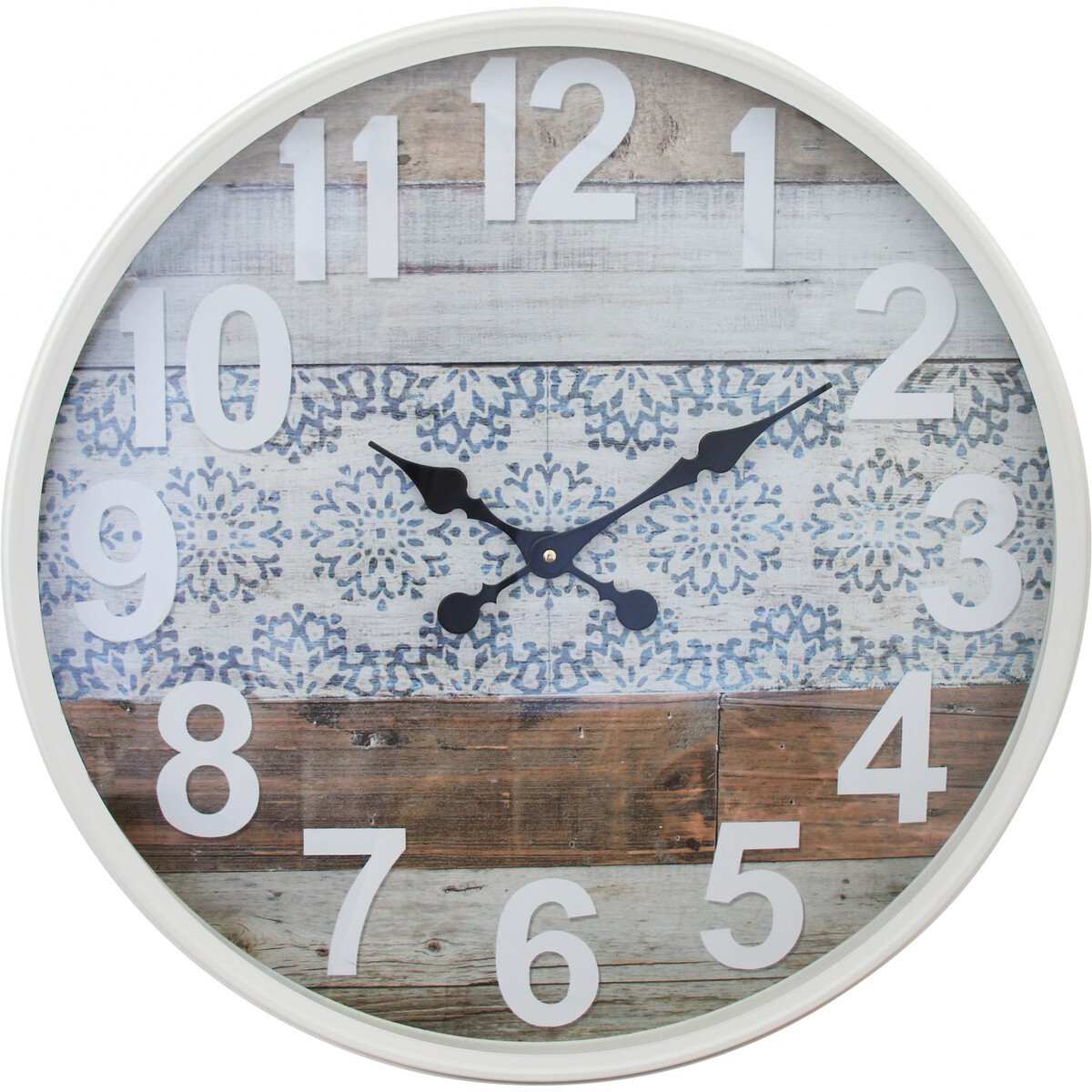 Round and shapely, the Clock Mix Media Vintage Framed is the perfect way through which customers can make grand decorative statement especially in interior spaces without being extravagant. This inexpensive wall clock features the arrangement of wooden boards side by side with each board showcasing a different colour and decorative finish. The biggest of the wooden boards has its surface beautifully patterned with brightly coloured floral motif. The clock hands are painted in jet black while the numbers which tell the time is painted immaculate white.