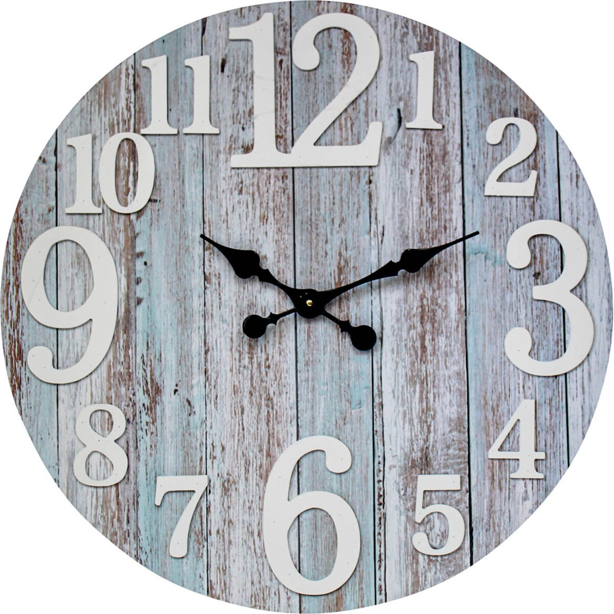 Made from MDF, this 70 cm diameter clock is a wonderful means to give a focal strength to wall spaces that are large. The beachy loo created on the face of the wall features a woody rustic background that get further highlighted by the rimless design of the clock, the numerals are in white in an irregular sized print adding further to its chicness. Will especially look bold and dramatic in spaces that are shabby chic and have whites and blues thrown in as a décor palette. Behind the couch-above the console or the sideboard or the archway-there are several spaces in your home where it will make a bigger impression. The hands are in black making it visible even from a distance. A grand clock to make its presence felt in the most modern of ways.