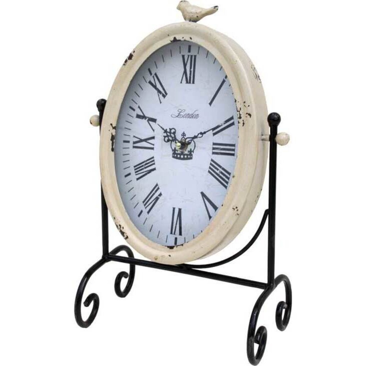 The black wrought iron stand is just the right frame to place this rather elegant clock in a pleasant cream colour .The material used is metal and the finish is the typical distress metal look that creates a vintage appeal with its chipped and peeled paintwork. The clock has a sturdy stable stand which can thus allow it to be placed on the mantle shelf, a large study table or a large corner of the house. Hard to be missed features include the clear Roman numerals on the face, and the gorgeous detailed black hands of the clock that allow you to see the time even from a distance. The tiny little bird on top of the upper rim of the round clock adds just that hint of feminine charm .A gift anyone will love to give or receive.
