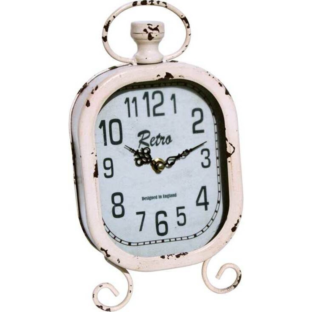 A wall clock with more than just time and digits on its face to offer - this retro chic clock made of distressed metal is great way to transform the look of the wall where it is placed. The bold print of the numerals , the clear wide face of the clock, and the slightly dull paper finish of the face is all reminiscent of clocks made in the early 20's when clocks were still called time pieces. The oval shaped clock can be placed on its delicately moulded pretty metal legs and has a size that will look can be visible as much from a distance. The clock hands are also neatly designed, delicate and black so that it can serve its purpose as a real time piece. The knob on the top and the framed handle allows it to be picked and placed with ease when one may wish to shift it to another spot. About a foot high and six inches across this is also one of those clocks that can be pretty much part of the decor as it comes with such great design detailing like the peeling paint effect for vintage look and the dull tint of blue look of the face and of course the very design of the clock frame itself looks magically from quite another time. A definite must have for those homes and offices where style would mean a trip back in time, even for checking the time in the present!