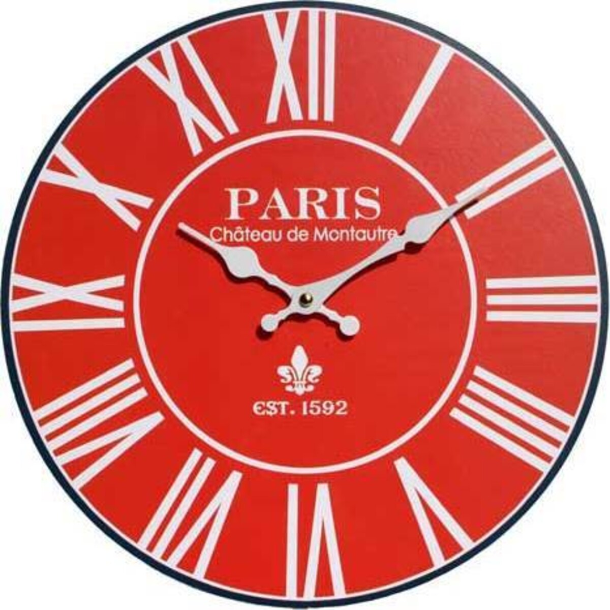 Featuring a bold red background, this clock has a black border around the edge, large white Roman numerals, and white hands. At its center in white lettering states, "Paris Chateau de Montautre" while at the bottom, white lettering reads "Est 1592" with a white fleur de lis over it. The vibrant colouring and style of this clock can easily transform any neutral or dark coloured space into one that's lively and exciting. It's amazing what a little clock can do, and all for a great price.