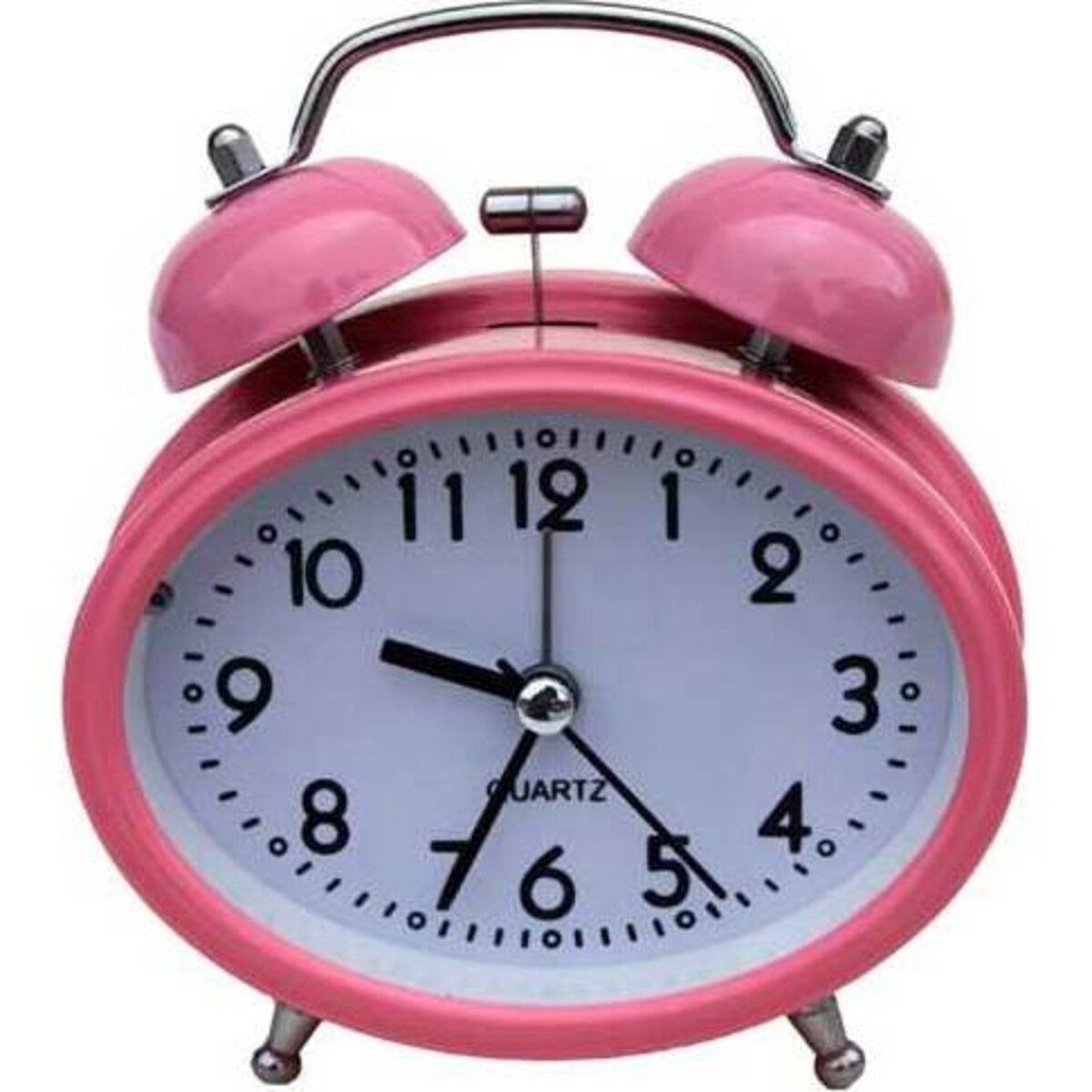 This clock is done in one of the most beautiful shades of frosted tulip pink we've seen. It has a soft luster that's reminiscent of retro style paint, without the brash shine that sometimes occurs with modern latex. • Clock is constructed of metal and plastic, with a squat oval shape and a grooved front edge. • Two round dome shaped bells at the top sound with an old fashioned ring when the alarm goes off. • Silver tone feet slant outward and have ball feet, and alarm setter and handle at the top have a gleaming silver tone finish. • Large numbers appear in black, and hour, minute, and second hand are also done in black metal. • Quartz movement.