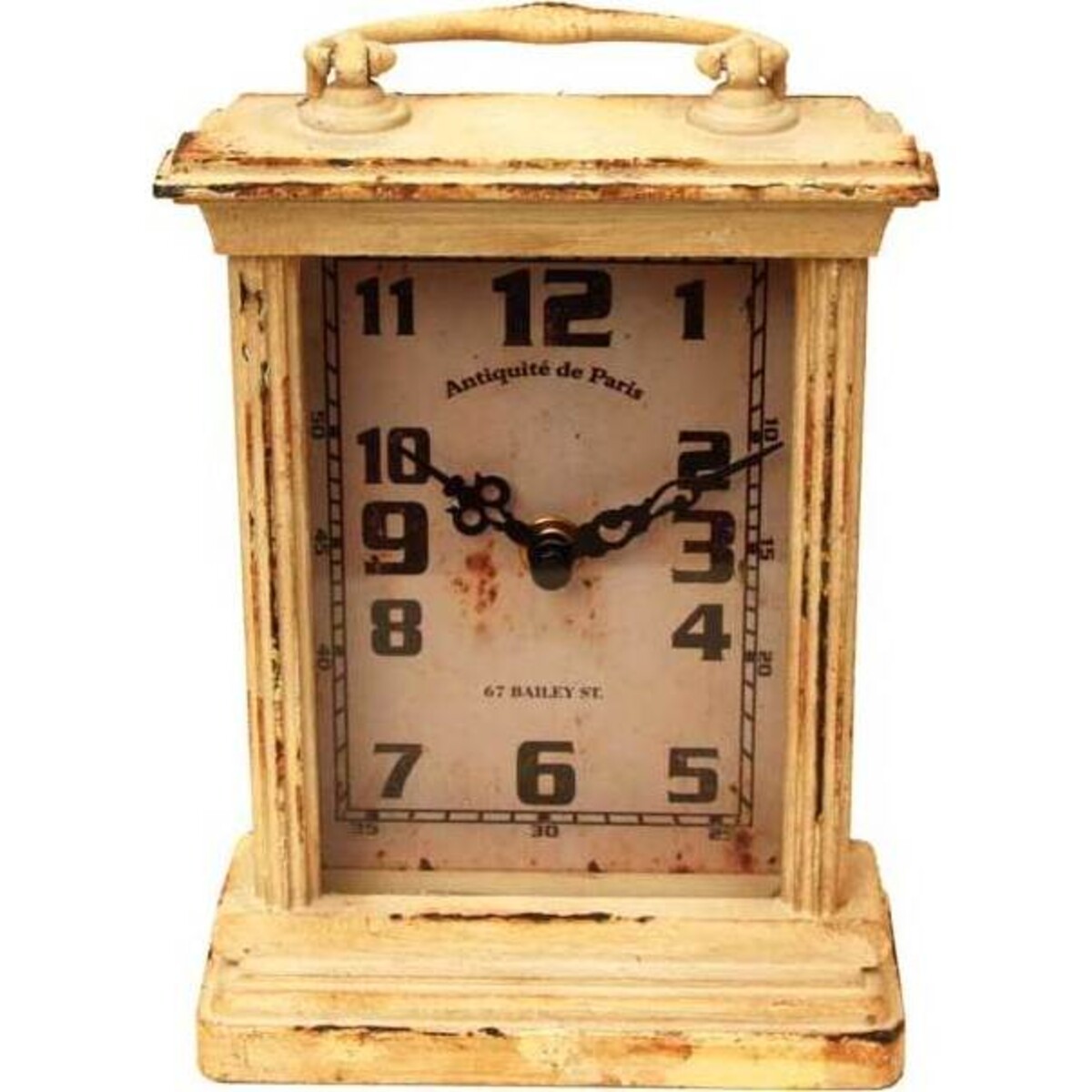 These cream - coloured clocks feature a column design on either side, a tiered base, and a handle at the top. The face of the clocks are off - white with oversized black numbers and black filigree hands. They also read "Antiquite de Paris" as well as "67 Bailey St." The clocks are worn and weathered to give them an aged appearance, so while they look several decades old, no one will ever know that they're not the real deal. Considering their exquisite appearance, you'll want to put one in almost every room of your home, and thanks to their colour scheme, you can do just that and it will complement the décor perfectly.