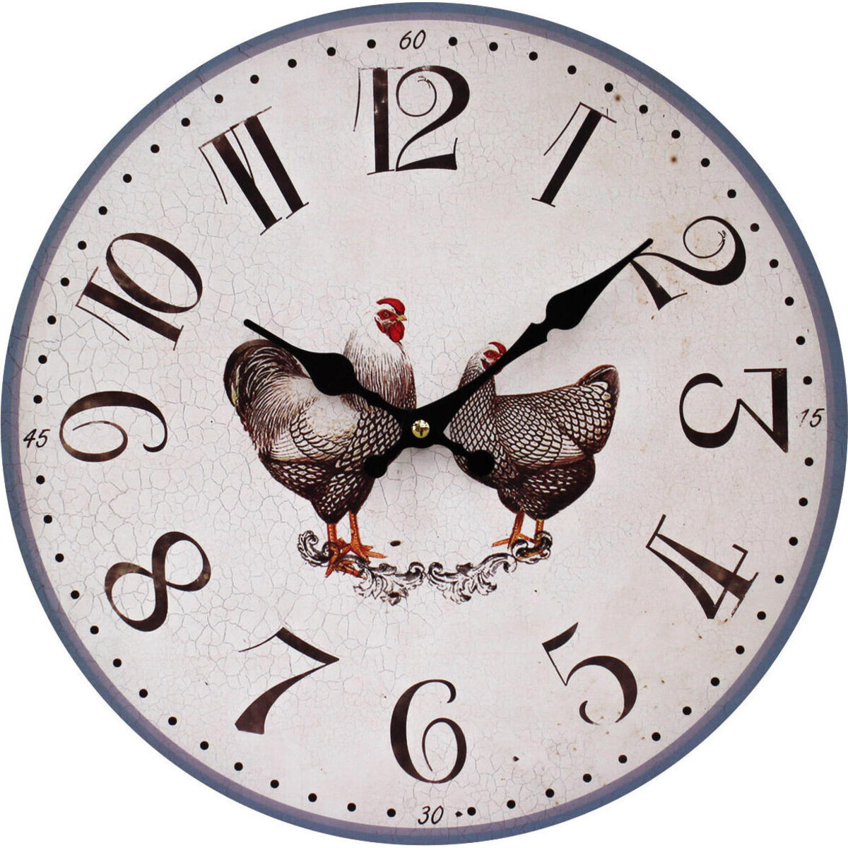 Featuring two hens, this clock sports both hours and minutes. The neutral tones of white, black, grey, red, and brownish yellow add antiqued elegance, while the large black stylized numbers and metal spade hands give a touch of contemporary appeal. Easy to read from a distance, it is perfect to hang in the back porch, where you can see the time from the pool! Both simplicity and versatility are guaranteed with this wall decor that will match any colour scheme of a room due to its achromic hues and can be hung at the entrance way or in the hall though it will suit best in a farmhouse kitchen.