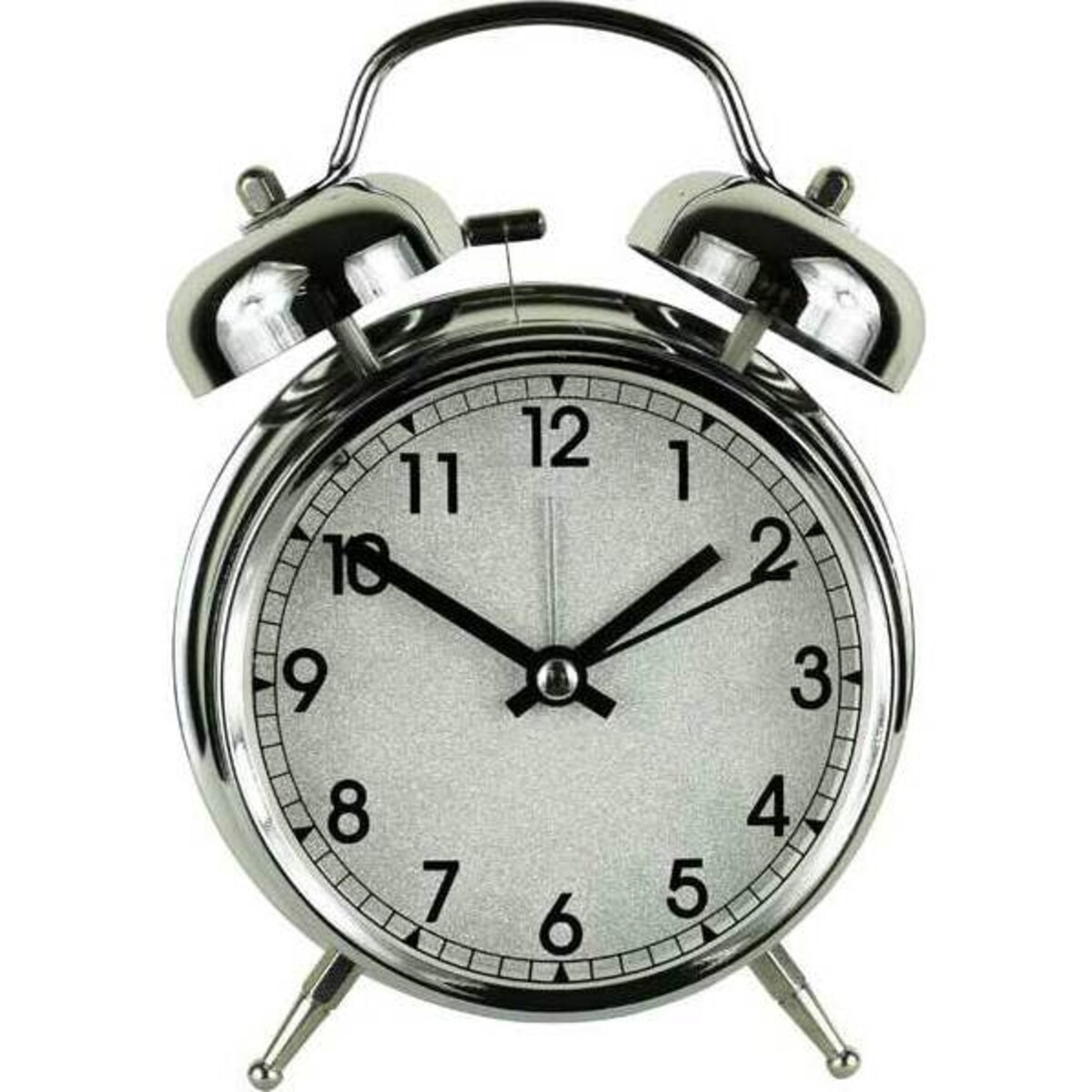 While we may have moved to the modern times there are some old world sensibilities that continue to govern our choices when it comes to interiors and decor and one such highlight that no space can do without are clocks-be it office spaces or homes we need them around-this table clock fabricated from metal, is a delight for many reasons. Sturdy and well designed; it looks like the clock from the turn of the century when waking up to the metallic sound of an alarm was natural. This feature is its most definite part of styling and can be seen on top of the round face. The chrome handle, the round face with clearly marked digits makes see in time even from a distance quite easy. A wonderful clock for the bedside or the children's room ?will give the feel of the days gone by ?when time was not at such a premium but timepieces such as these definitely were. The height of the clock from the base where it has two slanting legs to the top is about 16 cm. The face of the clock is about 11 cm in diameter has this sparkle of silver glinting across its face, making it clearly visible from a distance.