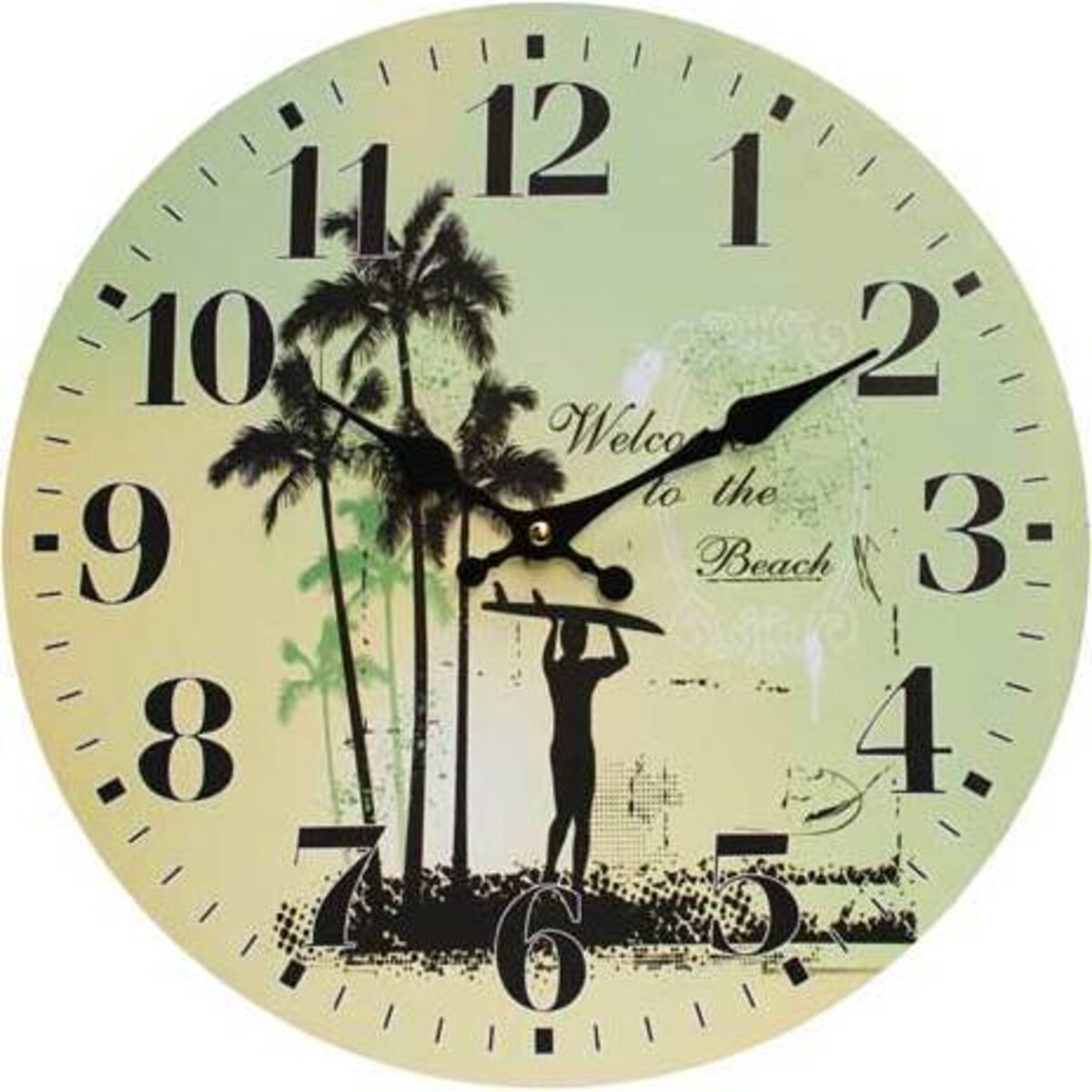 The Sunrise Palms Clock by LaVida is always set to "beach time." Crafted in MDF and finished in soft green and yellow hues, this clock features a black and green painted palm tree and wave motif, complete with a silhouette of a surfer and his surfboard as they head into the setting sun. The wording on the clock says "Welcome to the Beach." Bold black numbers and classic black hands make this clock easy to read from a distance. The finish on this clock is slightly distressed to add subtle aged appeal. Measuring 34 centimetres in diameter, this clock would be a welcome addition to an aspiring surfer's bedroom, study or work space.