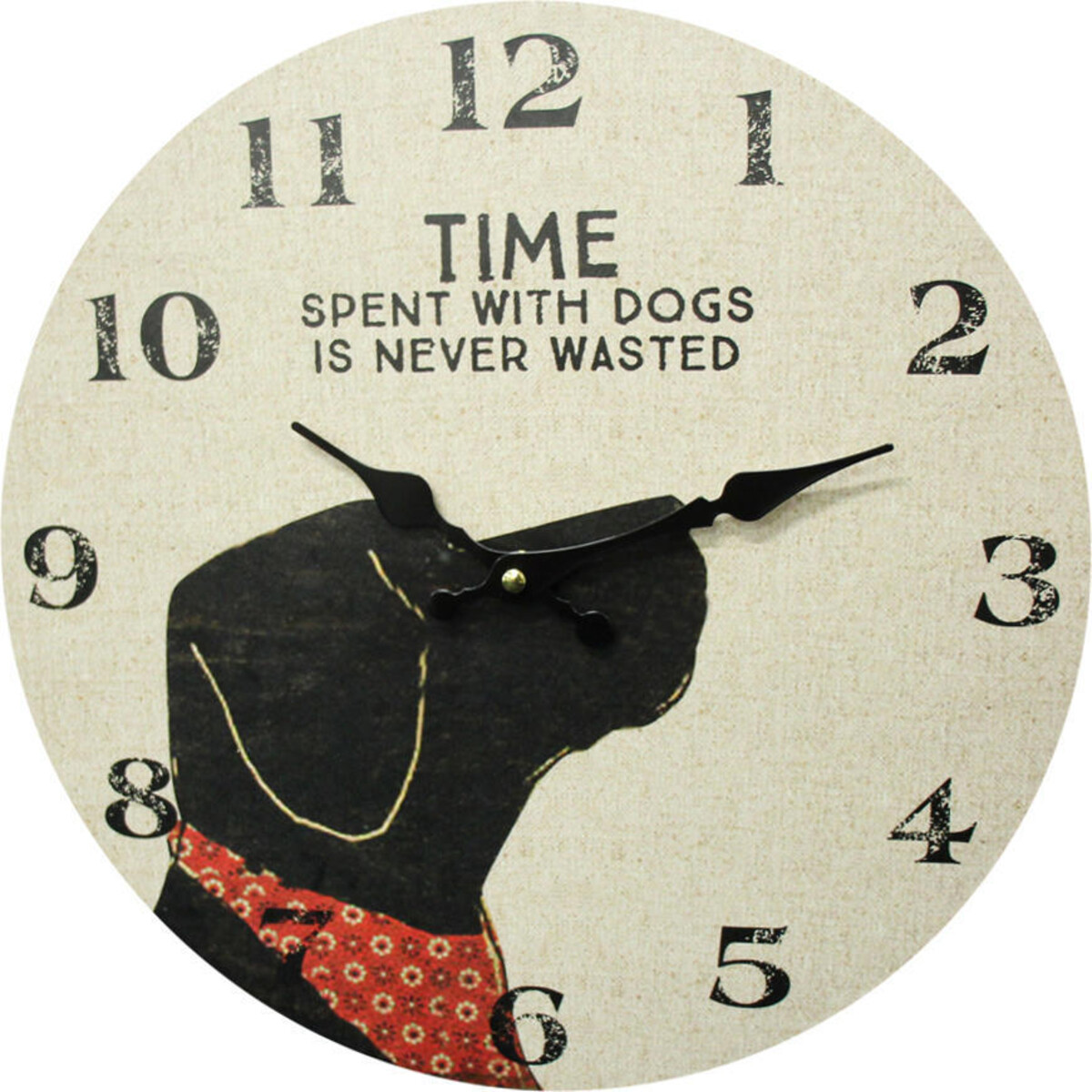 You always need that all important face to look at-yes-a clock?s face is one of those that you have to check every now and then to keep track of time . But when it comes to clocks form Lavida you are sure to get more than just accurate time keeping from them. This adorable white and black theme d clock with the dog graphic steals your heart right out with its look. Featuring the face of a retriever, with its floppy brown ears and head tilted up, as if looking at the wonderful words that any dog lover would agree with right away! The white face of the 34 cm diameter clock has numbers in black and the hands to are dark which makes seeing the time from a distance so much clearer. It simply says what any dog lover would love to say. The red scarf along the do?s neck adds that pop of red to add to the attractiveness of this piece. Great for any space in your home.