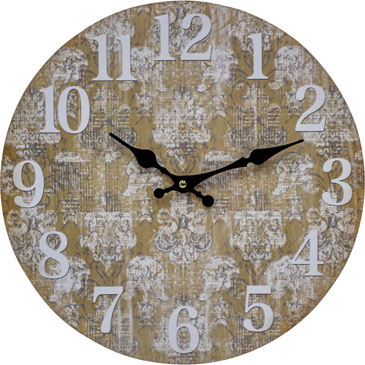This large wall clock has an aged dial with crackle background. With Clock Vintage Motif, one can uncover the significance of time and passing moments. Clock Vintage Motif will look fascinating and unique if tucked into bookshelves. Trinket box and other ornate can be paired with this piece so it nestles tightly in the shelf. The vintage cream-coloured dial has faded white and grey floral pattern. It is patterned to matches any interior decor. This vintage styled item makes a beautiful present for at housewarmings, weddings, and commensurate milestones achieved by friends and families.