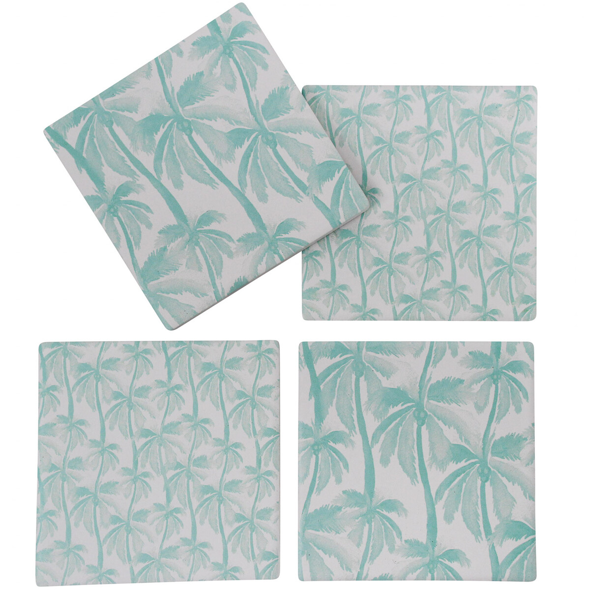 Artfully hand crafted in a square shaped portable sized dimension which measures 10 centimetres in length, 10 centimetres in height, and 0.7 centimetres in thickness, this Coaster Palm Marine is not only conspicuously ornamental, but also immensely functional for use in preventing mugs, bottles, wine glasses, and all other kinds of cups from causing stains, scratches, or dents on tables while drinking or seeping our favourite drinks. The first two set of coasters showcase a close-up image of palm trees in cool shade of green. The other two features more palm trees that are a bit distant.