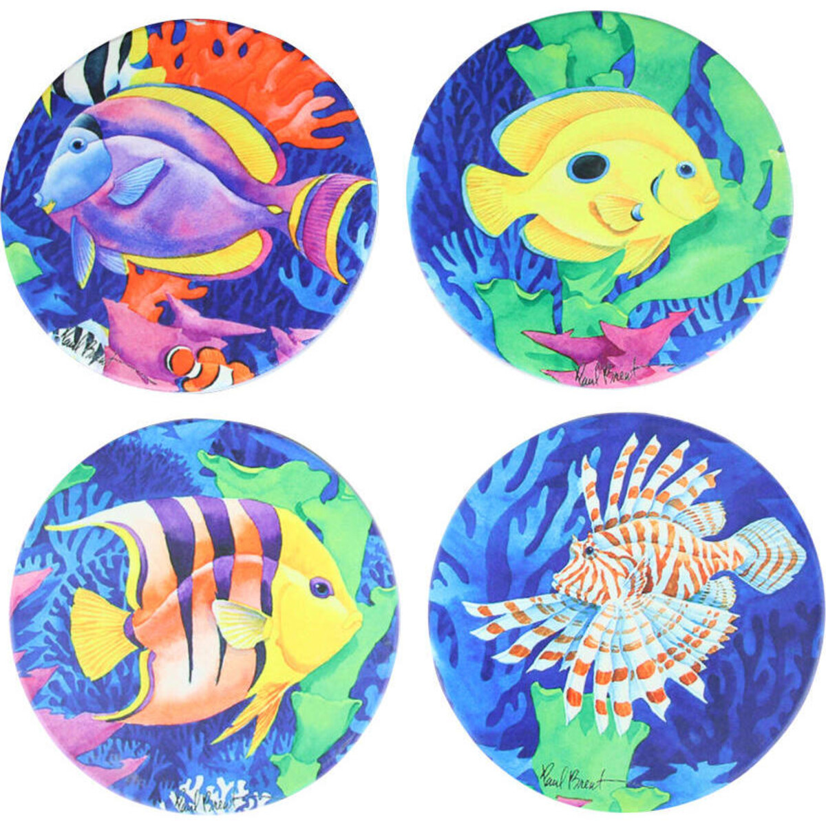 You have always dreaded the after - party hours - as you have always spent them cleaning the ugly residues of glasses and cups that have landed on table tops, sideboards, coffee tables, consoles and the like. The water rings and in some places the heat from mugs and cups leave stains that are terribly difficult to get rid of. The easiest solution comes in the form of coasters made of ceramic that lend your space the touch of colour, design, gracefulness and an idea and form. This marine themed one brings the magical world of fish through a perfect printing technique that creates such a bright image. Fill the space with cheer and liveliness with this set. Place them on study tables where kids study, or on the bar where you could have a marine theme. You will find that the ceramic coaster is easy to clean and gives a wonderful protection to the wood or glass from rings and stains that glasses tend to create. This set has four pieces each with brightly coloured fish and has been given a cork base to make them skid free and more durable.