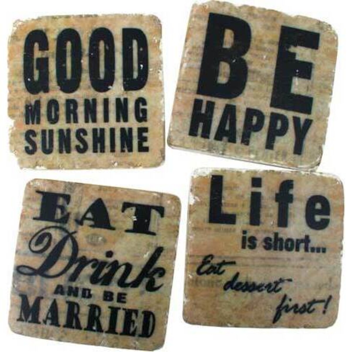 Introducing the adorable and charming Be Happy Coasters from LaVida. Each of the four tan coasters features a different saying in black lettering that reads "Good morning sunshine," "Eat drink and be married," "Be happy," and "Life is short...eat dessert first." While they do serve as every day reminders, they're also a perfect way to protect your furniture from water marks and nicks from glasses, mugs, and bottles. Keep the coasters for yourself or give them as a gift, but they'll be adored wherever they're used.