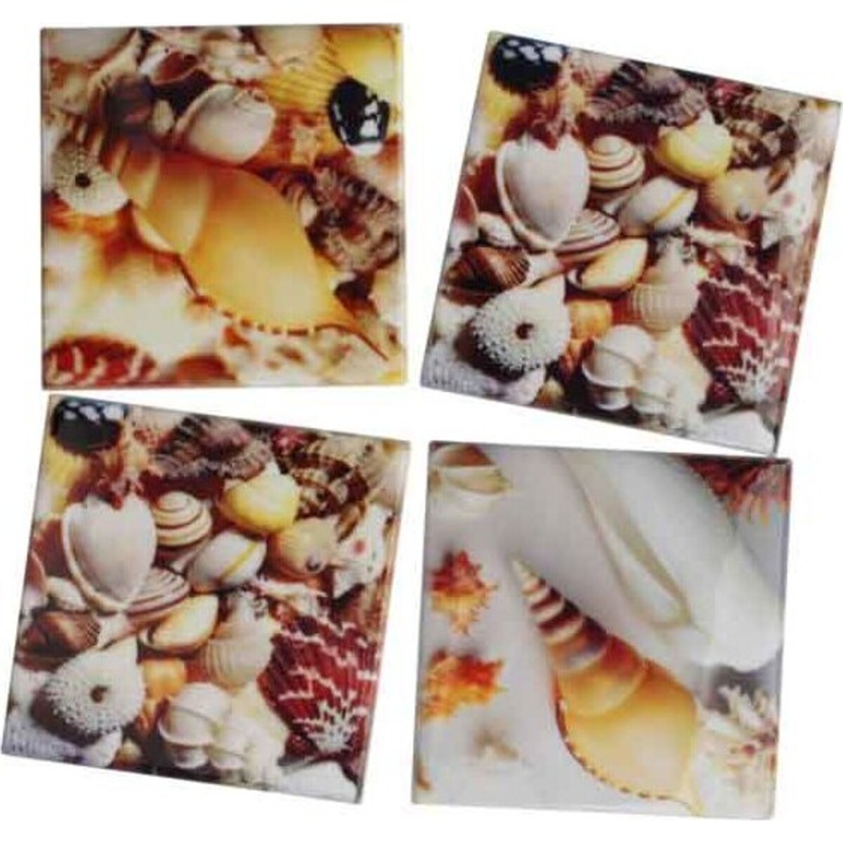 One design showcases a cluster of small shells in a wide array of collection. The other two shows off one big spiral shell with petite seashells in the background. Coasters are square shaped with smooth surface.