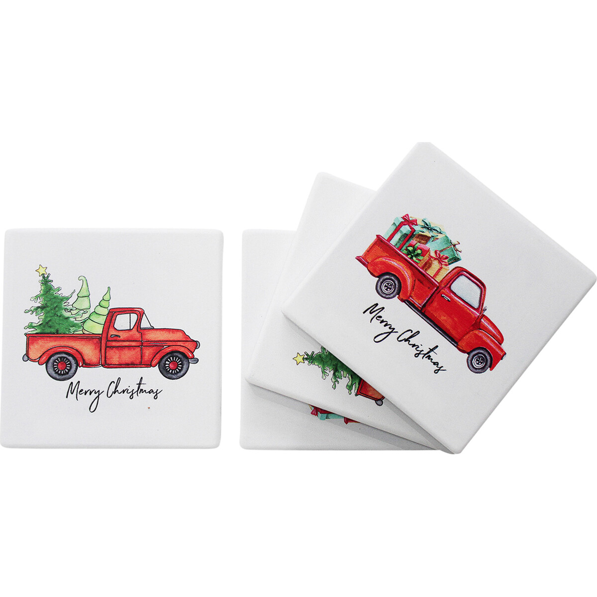 The Coasters Christmas Ute is a set of coasters specially designed to add such festive colour and enjoyment to your customers Christmas celebration. It does this through its square shapeliness and the beautifully glazed Christmas motif featuring the image of a truck conveying Christmas tree and a perfectly suited Christmas festive greeting. There are two Christmas motifs on all four coasters. On the first two coasters, a red painted truck can be seen conveying several wrapped gift items. In the second motif, the same truck can be seen carrying Christmas trees. In both designs, there is the festive greeting of "Merry Christmas".