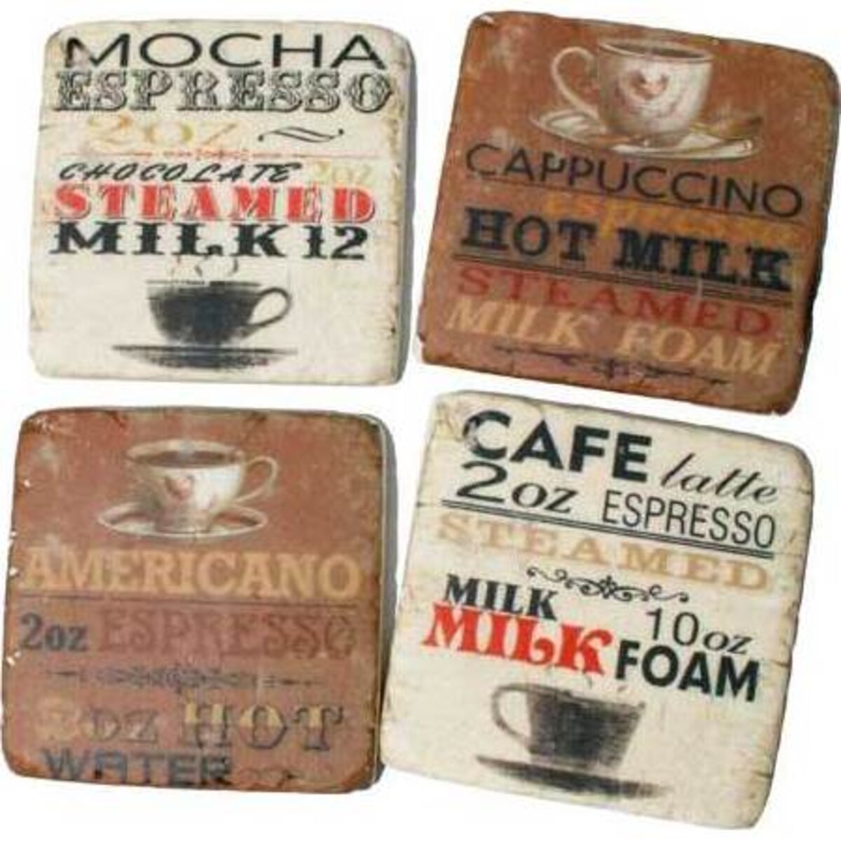 These coasters will be popular with coffee lovers and incorporate an informal, rustic feel as if straight from the coffee houses of a great city. Each coaster describes a different coffee type in its own stylish way: cappuccino, mocha espresso, cafe latte, and Americano espresso. The details of the recipes are also cleverly included on these coasters to add further interest and draw the viewer into the subject of coffee making. The background colours of tan and whitewash are warm and provide an elegant surface for the patterning and many fonts used. Each coaster is very different in terms of layout and font types used, making this set versatile, unique, and a wonderful way to decorate many rooms in the home. The texture and tone of these coasters will allow them to suit many styles of furniture such as tables, sideboards, kitchen surfaces, and bedroom dressing tables.