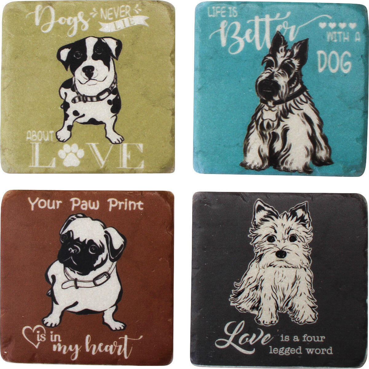 Coasters are great boon to have around any table-after all the arduous task of cleaning up water rings and the likes. This delightful set of coasters, each in different colour and featuring the most adorable of dogs on its face will instantly help lighten the mood adding that essential cheerful feel to the space. Made from resin, they can be wiped clean and their vibrant colours-each different in all four coasters, will remain fresh and bright for a great amount of time despite usage, as safe for using with very hot mugs, glasses and bowls as with cold glasses. They are skid proof and will retain their shape and form. The delightful graphics with printed words alongside can be seen clearly. The vintage shades of rust, yellow, blue and charcoal great also add that much needed colour to table tops that need some brightening up. Keep them handy around tables especially when guests are expected and reduce the burden of cleaning up ugly stains later.