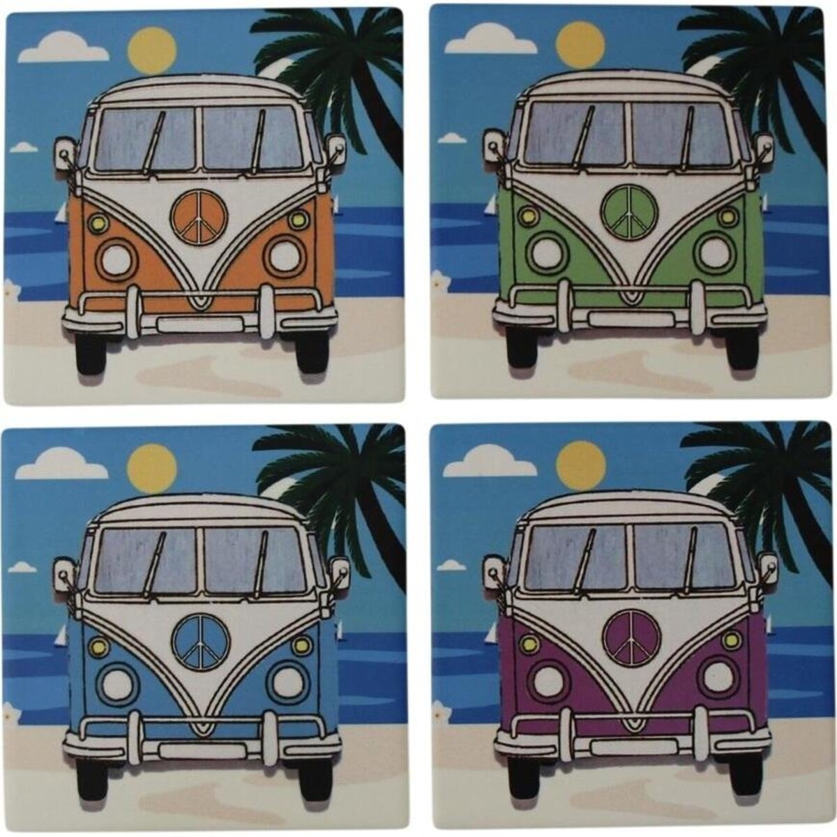 Coasters are one of the best means to keep messy table tops from creating more havoc for your home, after all, who likes to see water rings and tea stains on the table cloth-an easy means to keep your cleaning up chore at bay is by offering in several table, such colourful and attractive coasters that will ensure that heat stains, water rings and coffee stains are a thing of the past. The clay made coasters are given a flat base which assures you of skid free usage which otherwise is the problem with ordinary coasters that slip when placed on watery or damp surfaces. The delightful bright print of holiday caravans fills the space up with a certain cheeriness. The coasters are square and each one reflects the same bright graphics with multiple colours. 11 cm in dimensions makes it large enough for bar tables, coffee tables and kitchen counters alike.