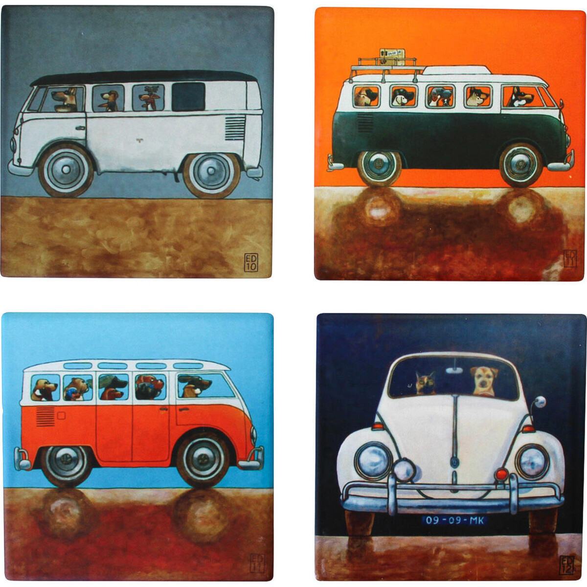 The bright auburns and blues startle you with their bright presence-the delightful pictures of dogs n wagons sure to lift your mood to quite another level of cheeriness. This set of four resin made coasters is a sure means to make your table top spaces come alive with a holiday kind of mood. The skid free material is easy to wipe clean and will retain their sturdy structure and shape-as well as colour in spite of much usage. The beauty of the set also lies in its very informal sort of look that could be used in any part of your home, work desk or sturdy table and help bring in a wonderful colourful vibe. Each of the coaster in the set has a unique graphic making it a wonderfully designed set.
