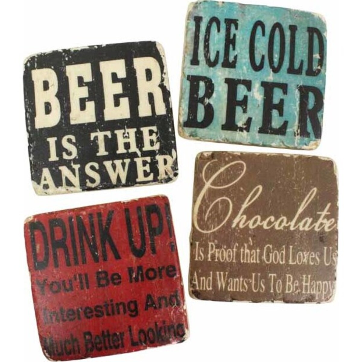 Furniture pieces must be protected especially from liquid stains or water marks. Servingware such as beverage coasters are therefore must have items. These pieces are great protections and shield. It is an important accessory for homes, offices and business establishments such as bars, restaurants, diners and so much more. For a unique and old-fashioned theme collection of servingware, Coasters Drink Up ensemble is the perfect choice. This set of coasters is made from high quality and thick materials. There are four unique and distinct pieces in the set. Each of the pieces showcases diverse palettes and texts. One coaster with black base highlights the text BEER IS THE ANSWER. Another piece in faded blue says ICE COLD BEER. The red based coaster reads DRINK UP! YOU'LL BE MORE INTERESTING AND MUCH BETTER LOOKING.