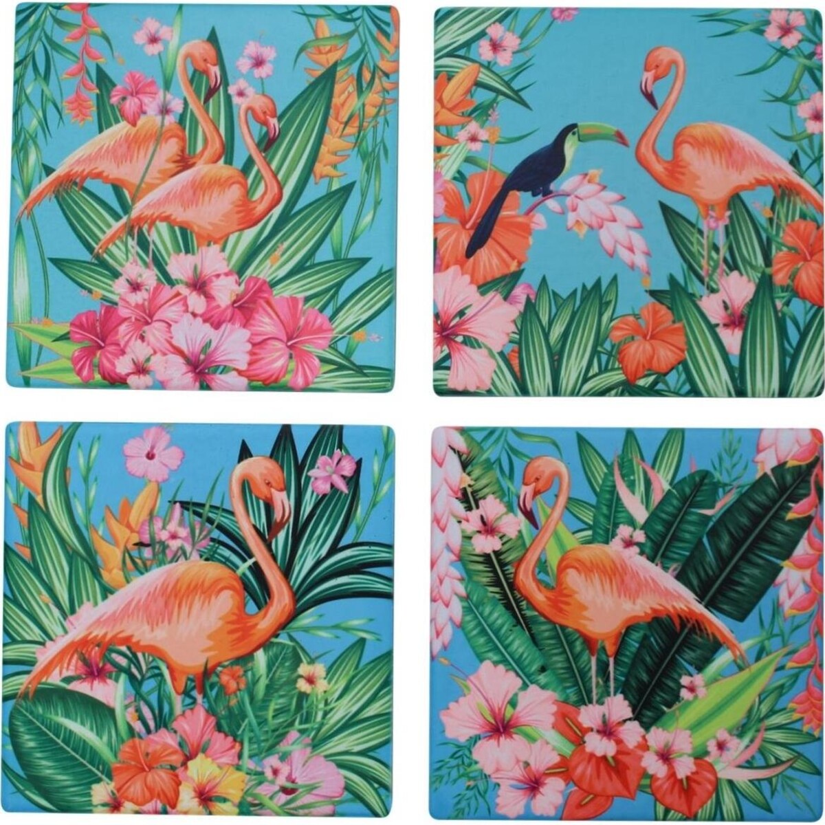 Give your table tops the beauty of things tropical through one simple inclusion-a set of resin made coasters that will help keep glass or wood top table free from stains and help make your after party hour clean up free from the arduous task of removing stains, made from fine quality resin that will keep the colours looking bright despite a great deal of usage, they will remain warp free and skid free even if there is moisture on the table. The set has four square shaped coasters each with a dimension of 11 cm, sporting flamingos in vivid pink colour, they have turquoise blue skies in the a backdrop and hibiscus plant with blooms, so utterly engorged with the beauty of nature that they will instantly make you coffee table, kitchen counters or any space you decide to use them on, feel more lively and cheery.