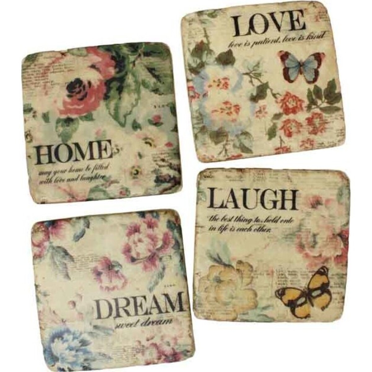 Each coaster highlights inspiration words and texts. The first one has the text HOME while the three others have LOVE, LAUGHTER and DREAM respectively. All decorative coasters have the vintage style beige colour background with prints of floral in diverse palettes and shade.