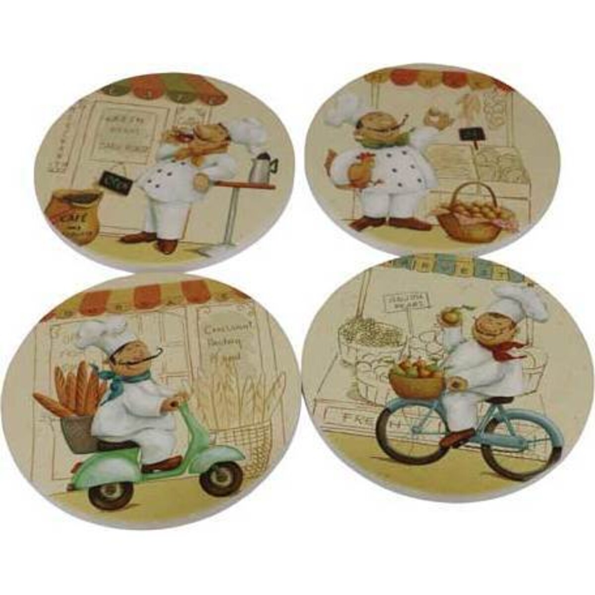 Choose from a range that has been introduced by Lavida for all who love their homes to be filled with guest or who love to share their cup of coffee in great company - and what better way to lend these relaxing moments something more in terms of colour - than this set of round coasters that has a strong Parisian theme right across all four faces. The cafe feel coasters has the proverbial French chef seriously at work - the imagery has been replicated with such adulation and the manner in which the colour tinting has been added makes it look so antique and classic. The coasters are made of resin on top which will allow it great longevity and the base is made up of Add these four coasters sized at 11 cm in diameter and see the look of a charming Parisian cafe come alive. Of course don't forget your espresso!