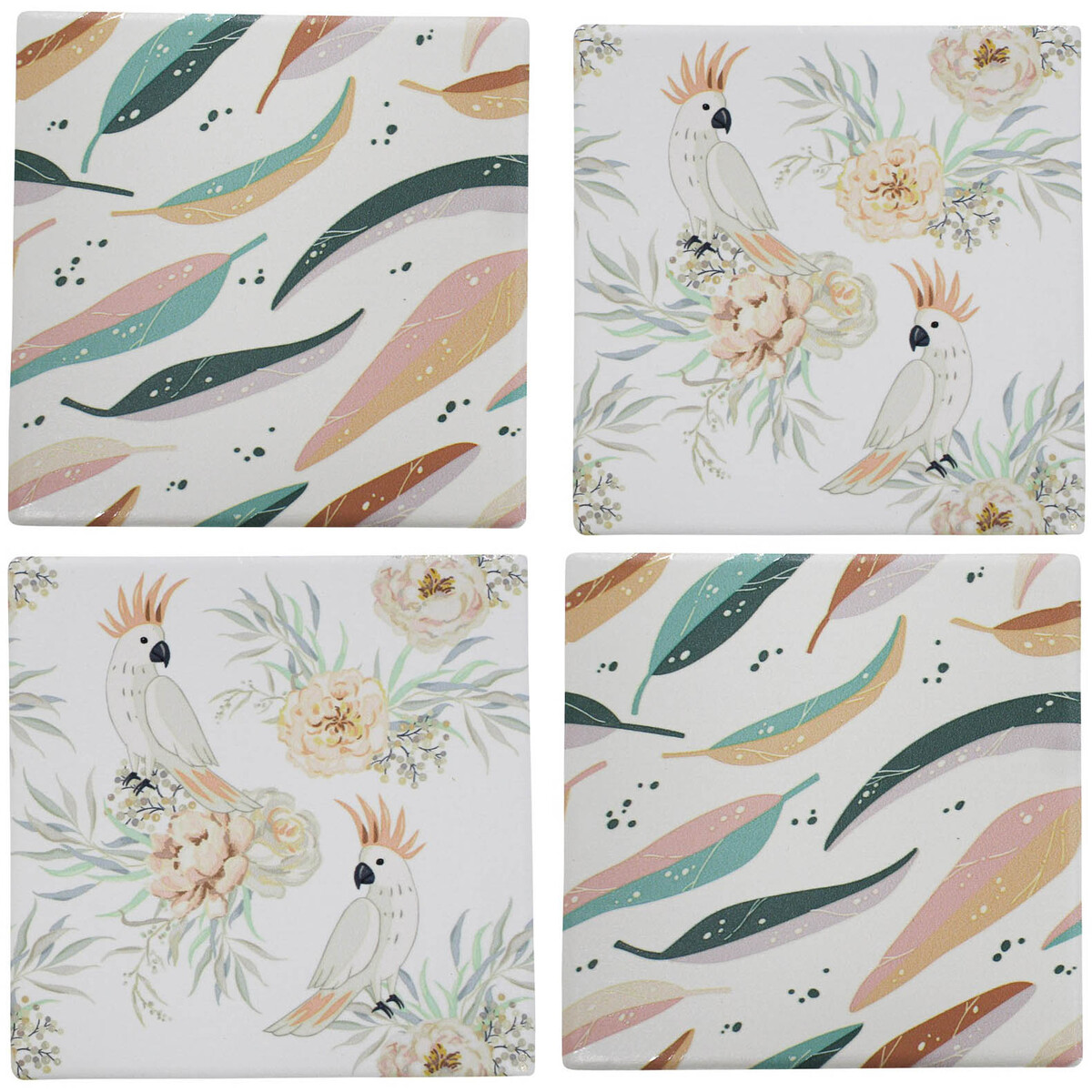 To keep you beloved table tops which maybe made of wood, metal. Topped with laminate or simply made of glass-look their best at all times-the usage of such ceramic coasters would be highly recommended. Made from high quality ceramic that has bene primed to look its best under the hottest conditions with pans and skillets brought straight from the stove and yet retain its best possible look. The gorgeous subtle shades of the botanical print along with the cheery parakeets adds to its attractiveness. Durable, water resistant, cleans in jiffy and is as great for platters and bowls as it is got jugs and mugs-they make quite a pretty statement when used on the usual dining table or the coffee table.