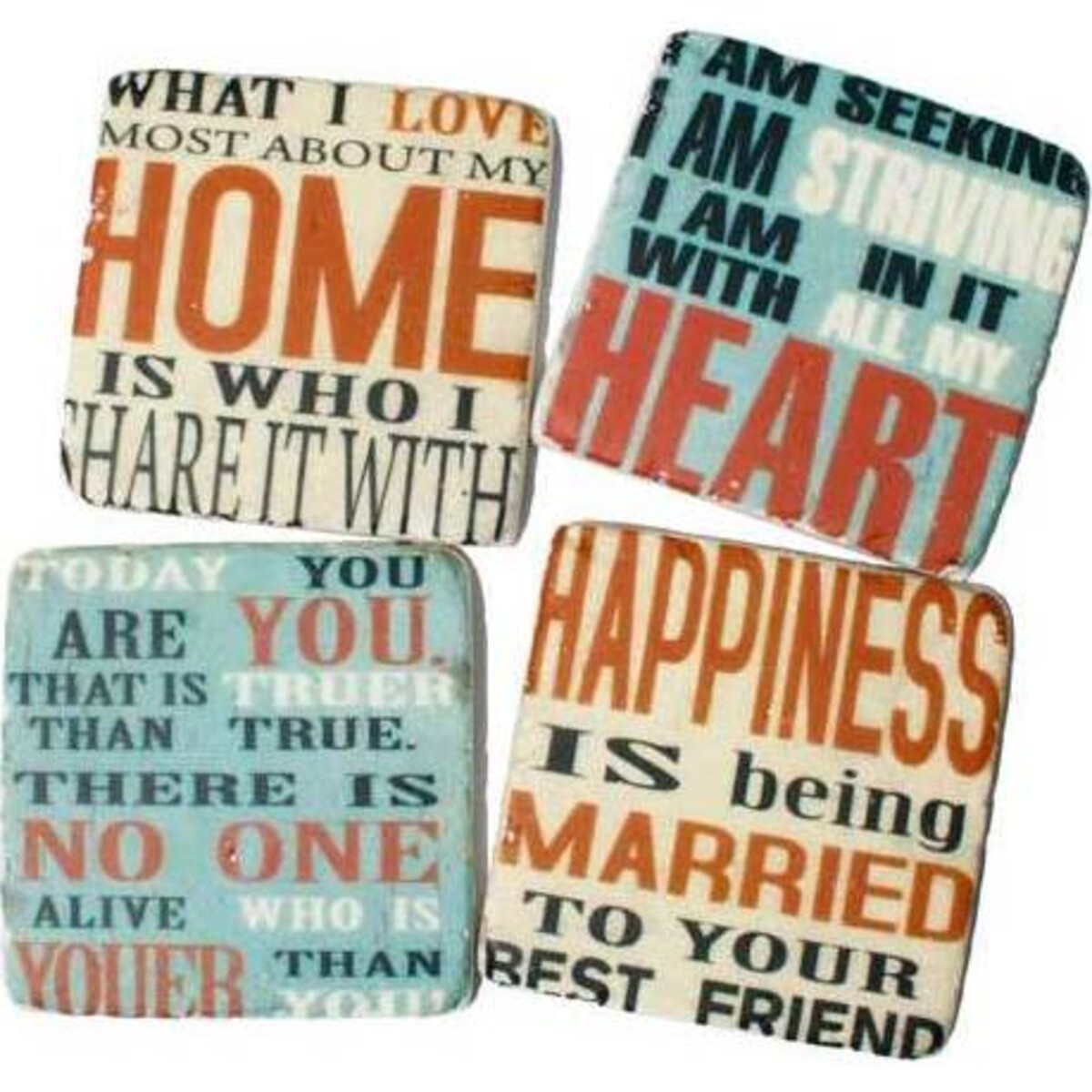 These coasters employ a sprightly design to deliver heartwarming messages with bold colourful lettering. The background of light blue and cream provides a natural look upon which the messages are printed. "WHAT I LOVE MOST ABOUT MY HOME IS WHO I SHARE IT WITH" is just one of the romantic sayings that will cast a subliminal feeling of love and comfort wherever these coasters are placed. The lettering incorporates much variety in the use of different font sizes, colouring, and position to make for an interesting, vibrant layout. Each coaster is different in terms of message, design, and colouring, so you'll never get bored with repeated styles, and each has its own way of delivering the upbeat sayings. The coasters suit informal, natural environments with their rustic character, and will easily meld into many rooms of the house.