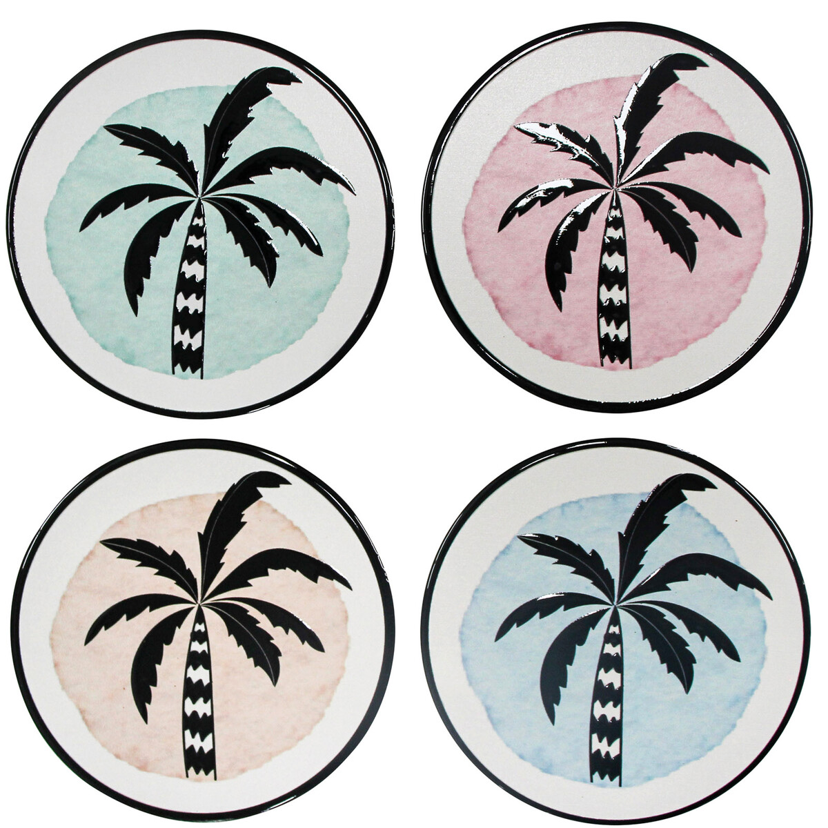 Coasters Mod Palms features four-piece coasters with each piece taking a different yet unique pastel backdrop. Made from quality ceramics and built with high durability, these coasters are resilient to tear and wear. All thanks to their glossy finish, these coasters have a protective coat against tea and coffee stains. Did I mention that they prevent scratches and stains on table surfaces? That's right, furniture is prolonged because of this protective ornamental kitchenware. What's more, this palm-inspired collection would be a thoughtful and generous gift to beach side lovers. Their portable size makes them perfect for coffee cups, glass cups, and mugs making them an excellent choice for a housewarming party.