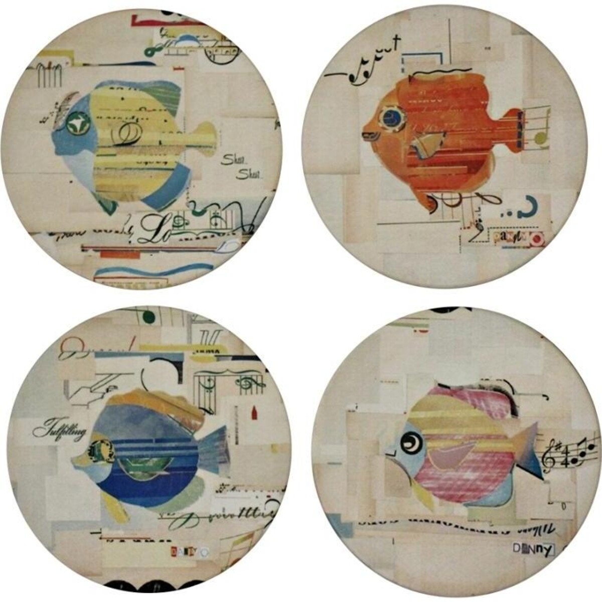 The set of coasters here on offer has been created from clay and felt - the backing given to it makes it skid free as well. The set has four such pieces each with a beautiful fish graphic with multitudes of colours aligning well with the theme. The chic modern design features colourful fish with musical notes as if in tandem with their swim of freedom. The round coasters seem to align perfectly with the pattern printed on them. Can be cleaned with a wipe of cloth and the printing has been done in such manner that wit will remain bright and fresh looking despite much usage. Keep them handy at the bar or the coffee table and you will set yourself free from the backbreaking task of wiping table tops and keeping them looking presentable. Chic modern and stylishly designed to help liven u your coffee time further.