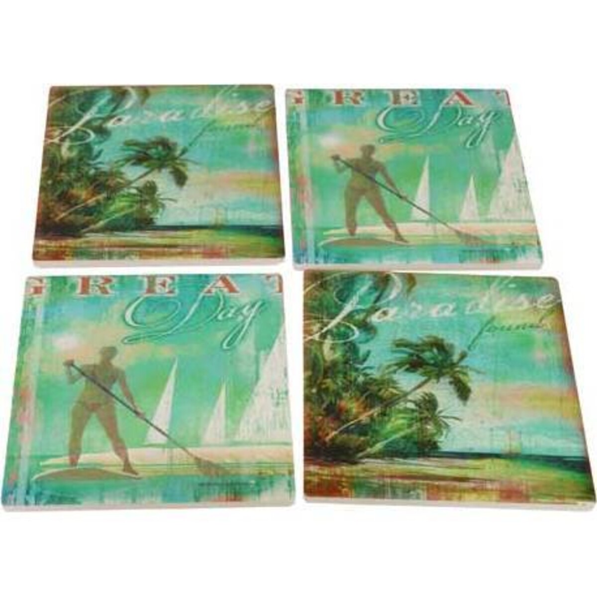 It is with much ease that coasters that have fabulous designs can bring so much of a difference in the way any space looks. Coasters carry with them a certain amount of homogeneity as they come in sets and so the very nature of their composition makes them carriers not just of images, colours but also messages and in this case this resin printed coaster will add so much of tropical paradise magic to the look. The words like Great Day, and Paradise instantly fills the space with the brightness of a cheerful day and a feeling that things around are resplendent. The turquoise blue skies, the plans are features that will lend much colour to the space. Use these coasters each time you have loads of guest over and the tables surfaces would need protection around the house. The resin top would be easy to scrub clean and the cork base will keep the coasters from slipping on any surface.