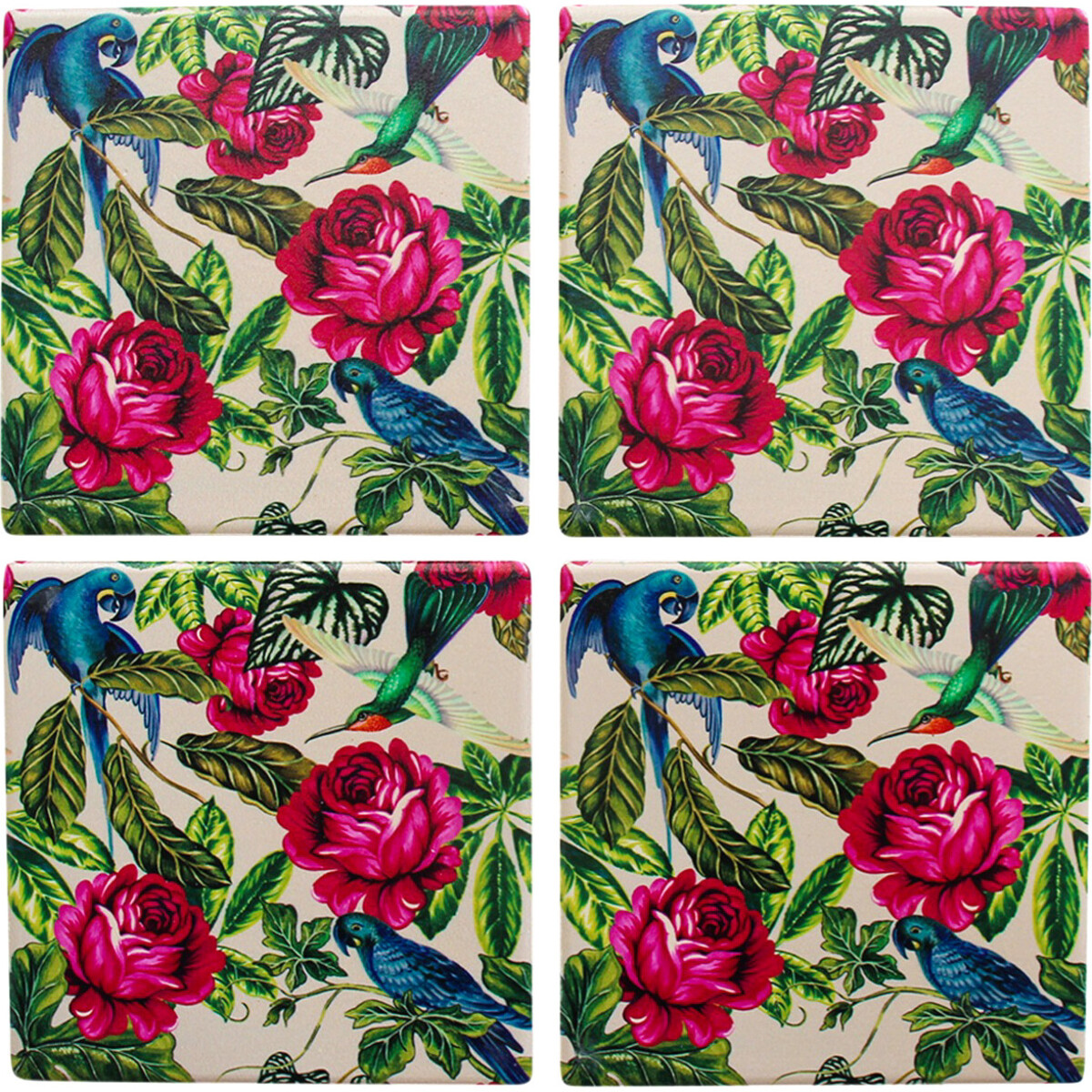The colourful coaster set brightens up the rest of your kitchenware with its vibrant aesthetic. It gives your table a sense of life and transports you to the world of flora and fauna as you sip on your beverage. This coaster embodies the simpler lifestyle that we crave amongst nature. Its design is a symphony of flora and fauna, entwined in the circle of life. As the parrot signifies intelligence in birds it will also signify your intelligent choice in decor. The burst of colours used in this coaster set gives it a slight vintage vibe. These stylistic hues complement each other in an eye-catching way. This coaster is sure to pop just enough to make it live in harmony with your other decor. Be it tea or coffee that you like, it adds a sense of beauty to all alike