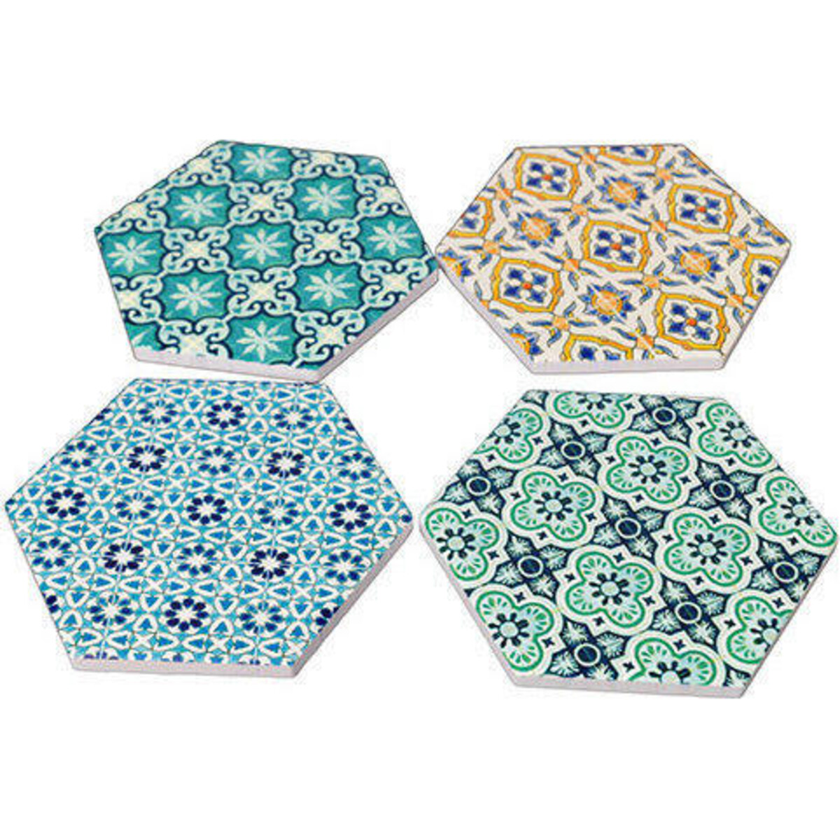 Keeping coasters handy around space that you frequently use for having your tea and coffee at will make the cleaning up of the table top surfaces far easier. Wet glasses usually leave ugly water rings on the surface and make the removal rather tough if they persist and remain on the surface for too long. Here are four coasters in hexagonal shape that have a lovely medieval design on its top. the lovely print has brought out the intricacy of the design and its colour in the best possible way. Use them on your bar as wine coasters or on your coffee table to make your relaxation time come live with more colour as when placed on any table, they will accentuate the space with their colour and brightness. Easy to clean up with a simple wipe of cloth, you could place several such sets in different places so as to make your job of cleaning up so much lesser.