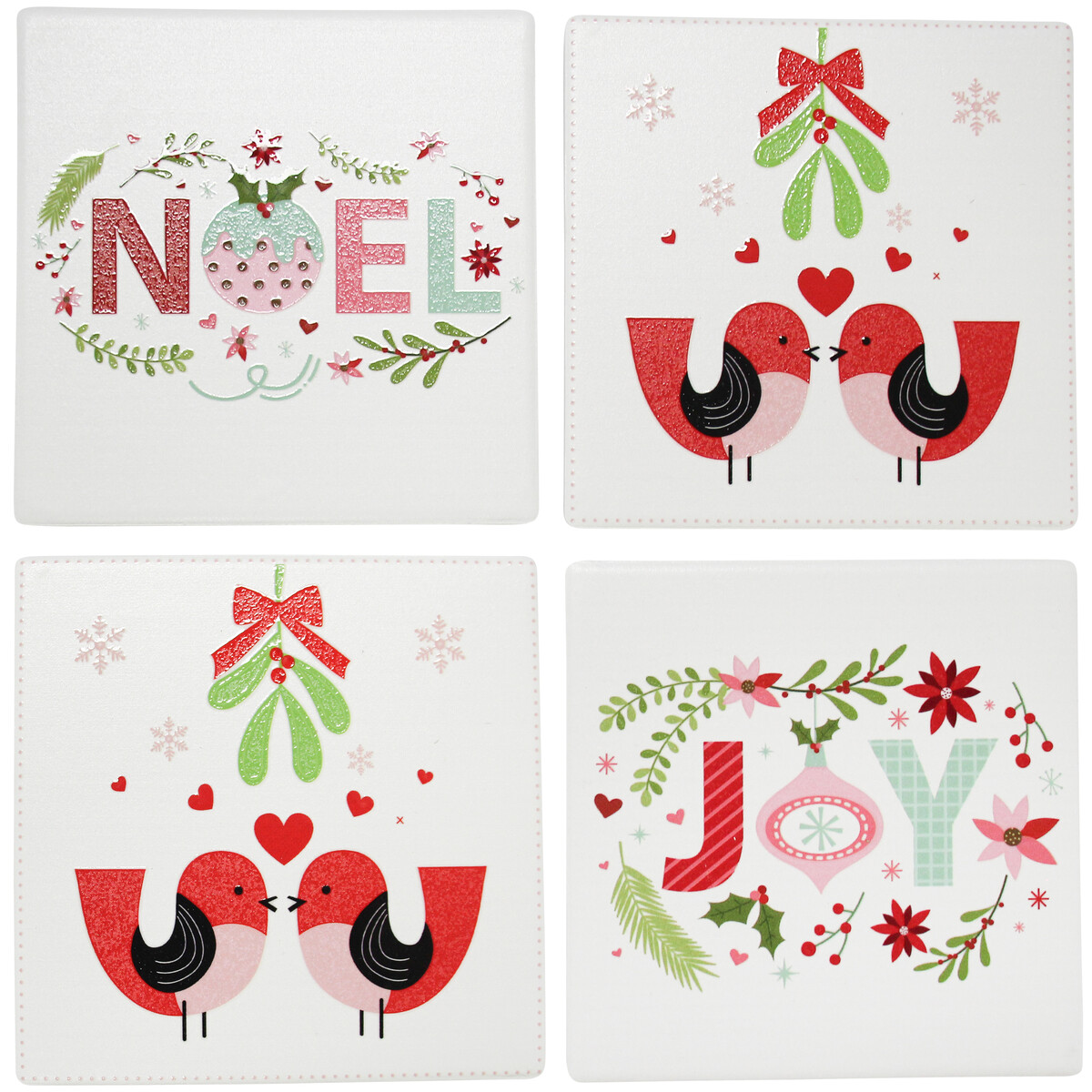 Consisting of four brightly coloured and beautifully ornamented coasters all of which are decorated with in the motif of a festive Christmas decoration, you would be wise to order as many as you can while it is still in stock. All four coasters are made in a square shaped design which measures 9.5 centimetres in length and an equal 9.5 centimetres in width. The first two coasters in this set have their surfaces decorated with the image of two birds facing each other and chirping away happily. The other two coasters have the word "NOEL" written on the surface with flowers decorating it.