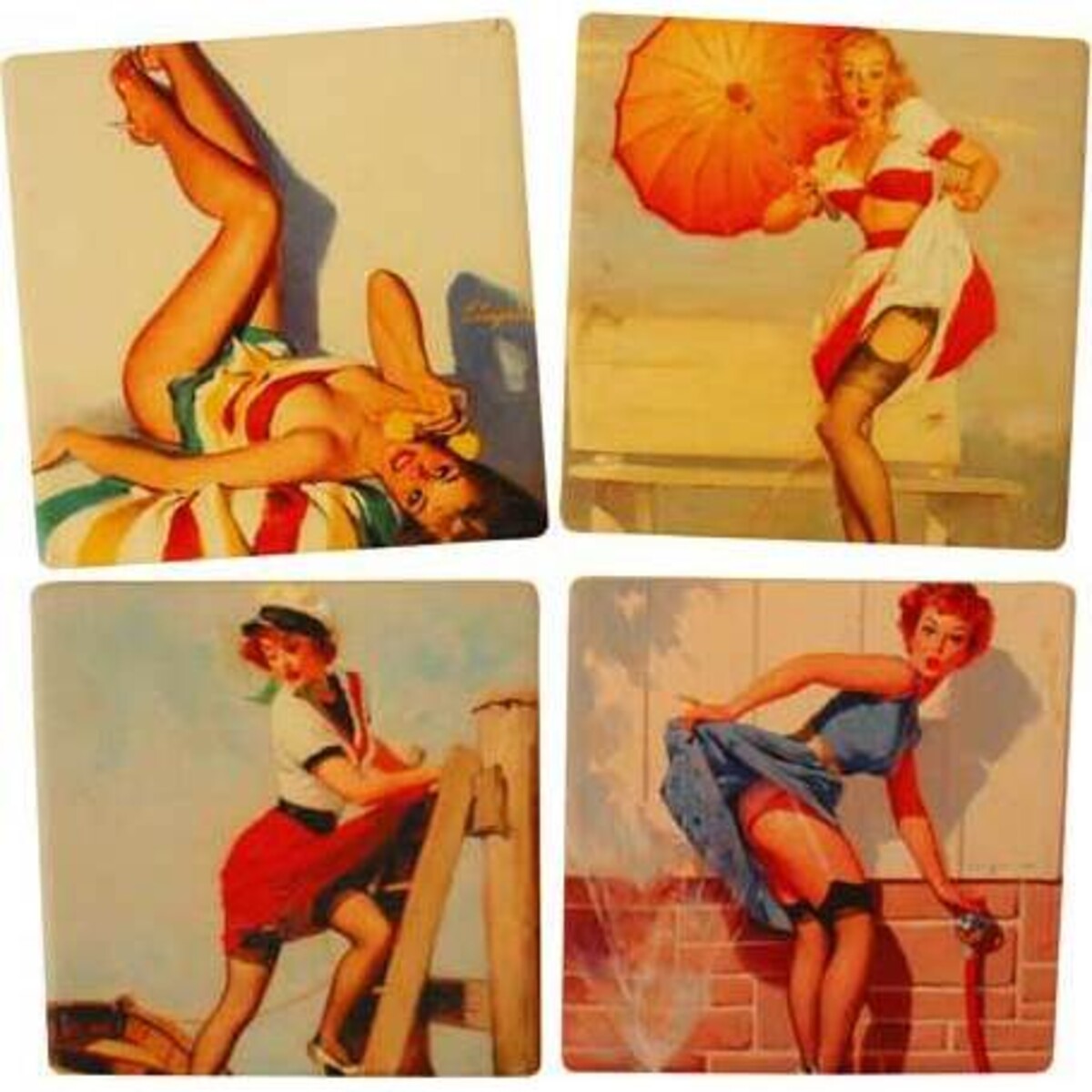 Add the zest of colour and save damage to your bar with the help of this retro style set of four coasters. Fabricated from dolomite they have bright vivid prints on them that feature beach beauties who are bold yet timidly so and rake in all the attention because of their demure depiction. A must-have for those bars that lack a little personality and some kind of protection to keep the counter from getting stained each time the place is used. The bright coasters will retain their brightness for long despite much usage and the print will remain looking like new. The coasters come in a set of four varied looks each with a similar beauty adorning the top. Can be cleaned with a wipe of dry cloth. Can be stacked and placed on the counter. The square coasters are 10 cm in dimension and will soon be your most attractive possession apart from of course the collection in your bar!