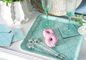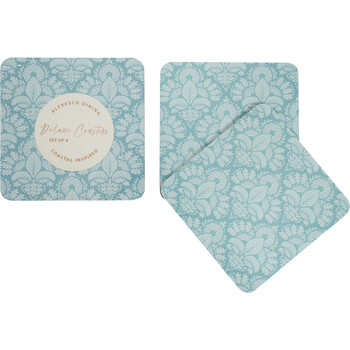 This set of four Damask coasters - probably one of the best-selling designs we've had lately, as far as we're concerned - really hit the sweet spot for blending classic homewares with fresh, summery vibes. It's this soft powder blue that appeals to shoppers across every age range. The botanical patterning isn't at all overwhelming, but it still adds a little something for the customer who's wanting a touch of pretty in a more coastal or Scandi interior. It's quite clever, we think - it manages to go with neutral, modern spaces and also with the more dressed-up traditional homes. These are sized at 10 x 10 x 0.4 cm, so they're going to be an easy fit for customers to use on their outdoor dining tables or lounges where you don't want much distraction from the other decor. We stick with this really sturdy MDF and cork combo because it's genuinely durable, holds up to everyday drips and knocks, and stores away just fine. You could even bundle this Damask set up with our other powder blue Alfresco tableware to help your shoppers build that complete summer dining look.