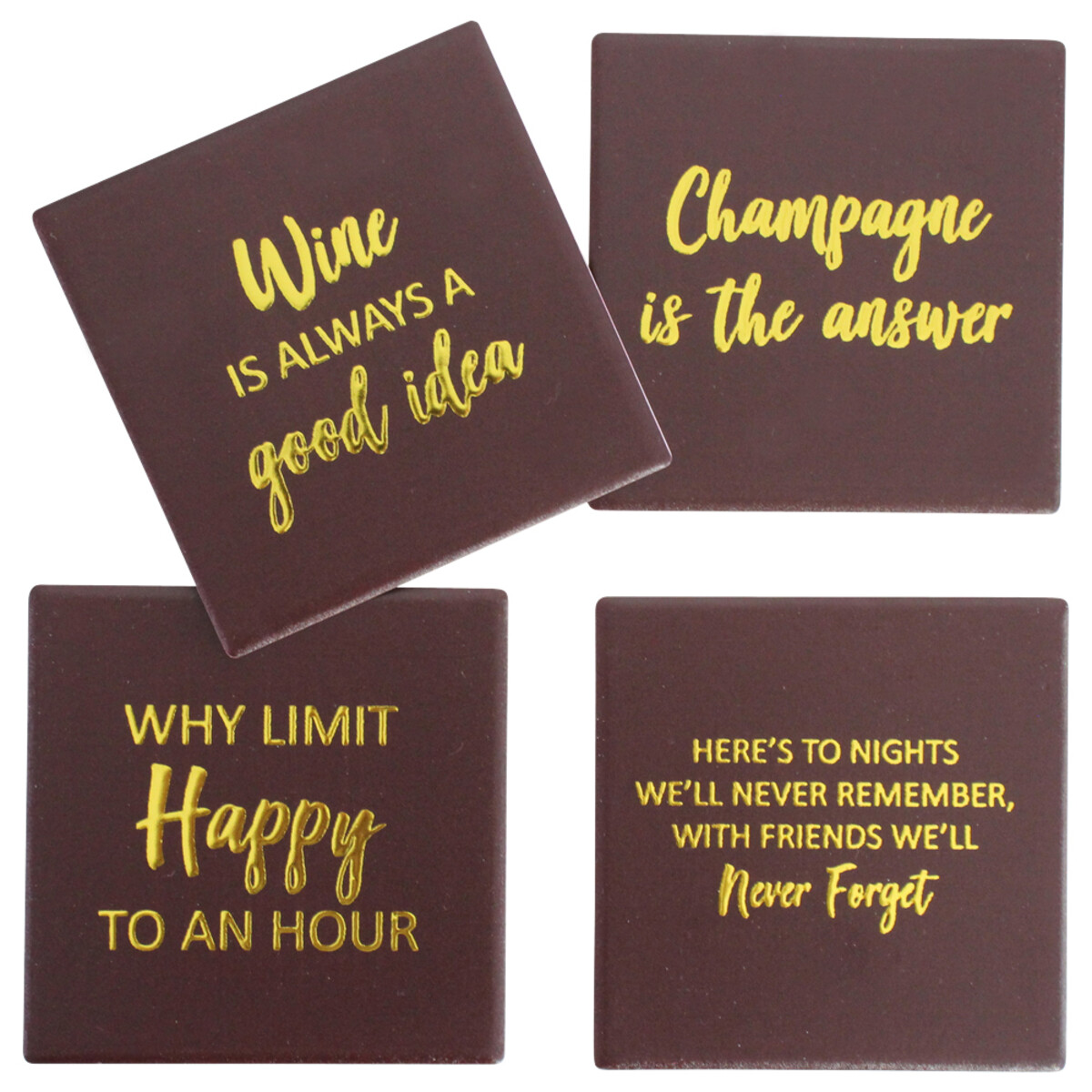This set of four Drink Coasters in Choc just makes us smile. We love the simple elegance of these. The deep chocolate shade works with most tables and surfaces - it adds a warm, inviting look, especially as an accent on marble or pale timber. And that bold script in glimmering gold is quite eye-catching, without being overly loud. We’ve found wine lovers are always drawn to these, but really, these work for anyone who likes to have a good time at home with their guests.