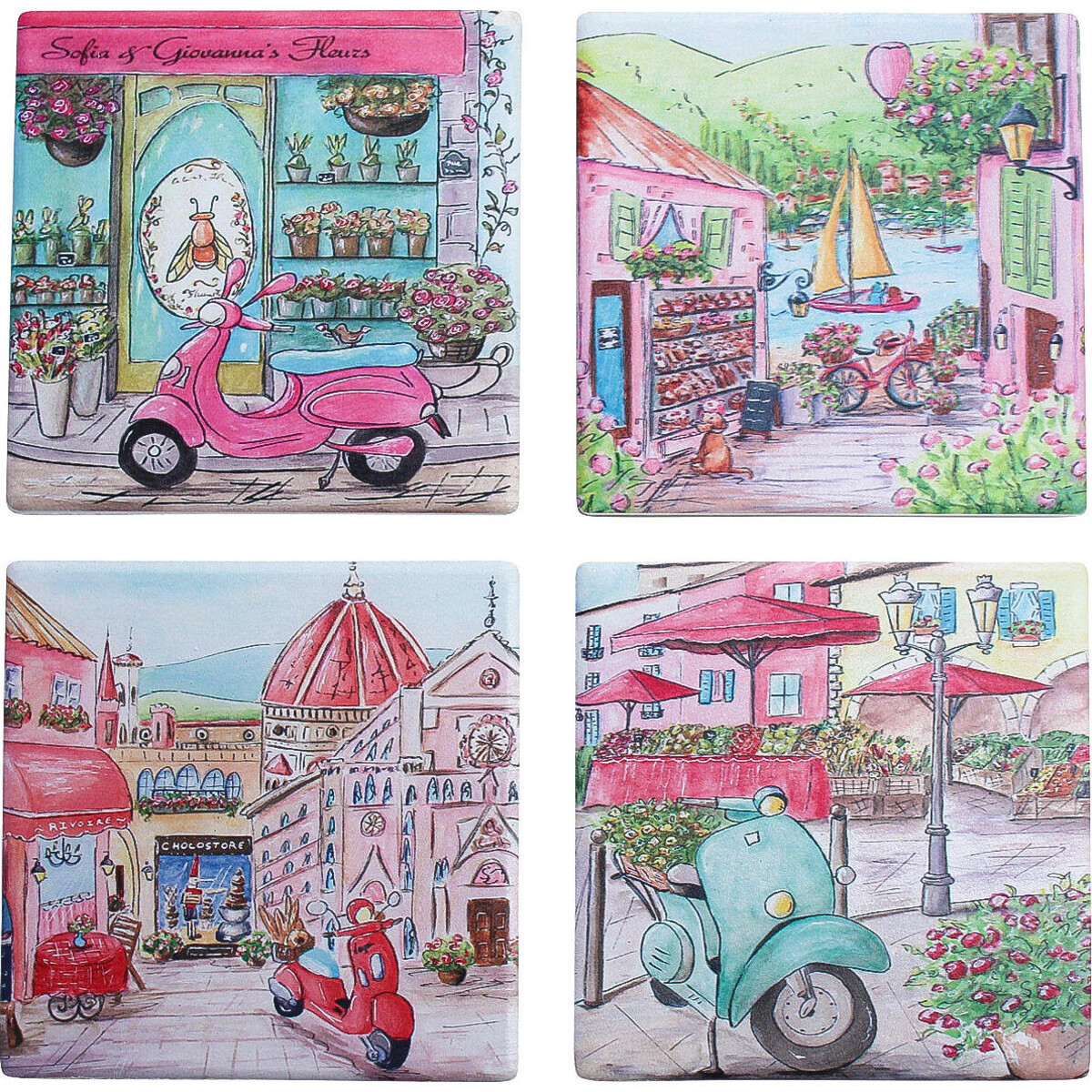 Keep your table tops looking shiny clean and ready to sue with coasters that have been especially designed to help keep polished table tops looking neat and clean at all times -especially of you have varnished kind of furniture the protection such coasters bring will save them from getting stained. Made from sturdy cork material-this is one of those additions of you wish to make your table tops remain spot free and well covered while also adding colours and vivid print that the face of these coasters come with. The square coasters come in a set of four and have scooters, bicycles, cafes, streets and floral backdrops that makes them overtly pink colour come alive with a certain chicness. Place them on your coffee table, or while serving snacks and you will see that those ugly water rings from chilled glasses or the singes from hot beverages will no longer cause you hours of extra hard work. the shiny ceramic top can e cleaned with a single wipe from a damp cloth.
