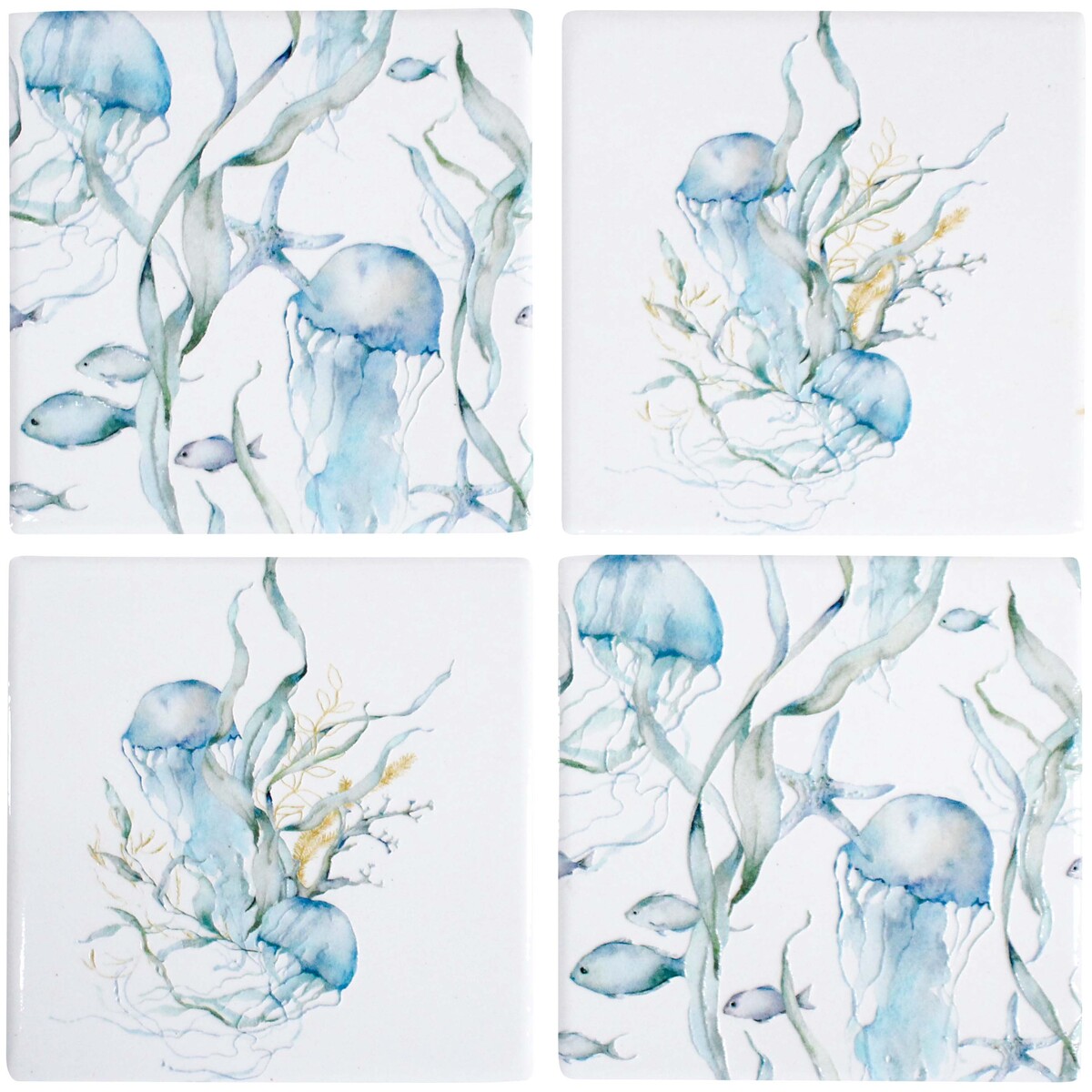 Our Coasters S/4 Jellyfish set is a delightful pick for any retailer looking to bring a bit of the ocean’s calming presence indoors - all without getting their feet wet. Each 10x10cm coaster features delicate, watercolour jellyfish floating amidst soft seaweed in tranquil shades of blue and green. We found this design quietly beautiful. These coasters are made from sturdy ceramic, so they feel substantial in-hand - no lightweight wobbly things here - while still being easy to wipe clean after parties, cocktails, or everyday use.