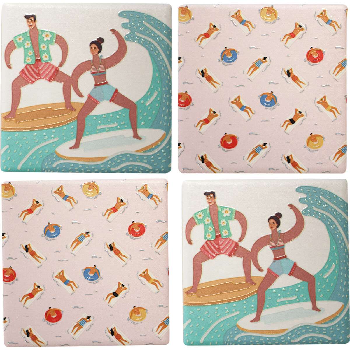 Coasters are an inexpensive gift items that is often in high demand due to their affordability, practical functionality and immense ornamental value. The Coasters Paradise Life is an alluring set of coasters that discerning customers would immediately recognize for its immense aesthetic value. The painted motifs include the depiction of a man and woman surfing sea waves on a surf board. The second painted motif of these coasters showcases a group of people relaxing in the water. Some are lying down on water beds while some others are suspended halfway in the water using a lifebuoy.