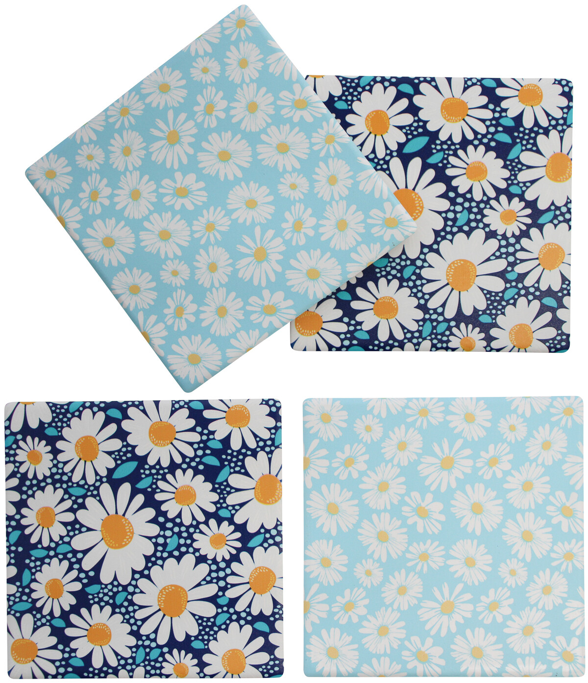 The Coasters Seaside Daisy S/4 presents four decorative coasters that would be perfect for use in transforming the general appeal of customers’ interior décor. This is because these coasters are beautifully handcrafted with several appealing features including its square shapeliness, the use of porcelain premium quality material, the choice of floral motif, and the use of both bright and pastel shaded palette. The first and fourth coasters showcases a pastel jungle green coloured backdrop with white and yellow daisy glazing while the second and third coaster have bright navy blue background with white and yellow daisy floral glazing.