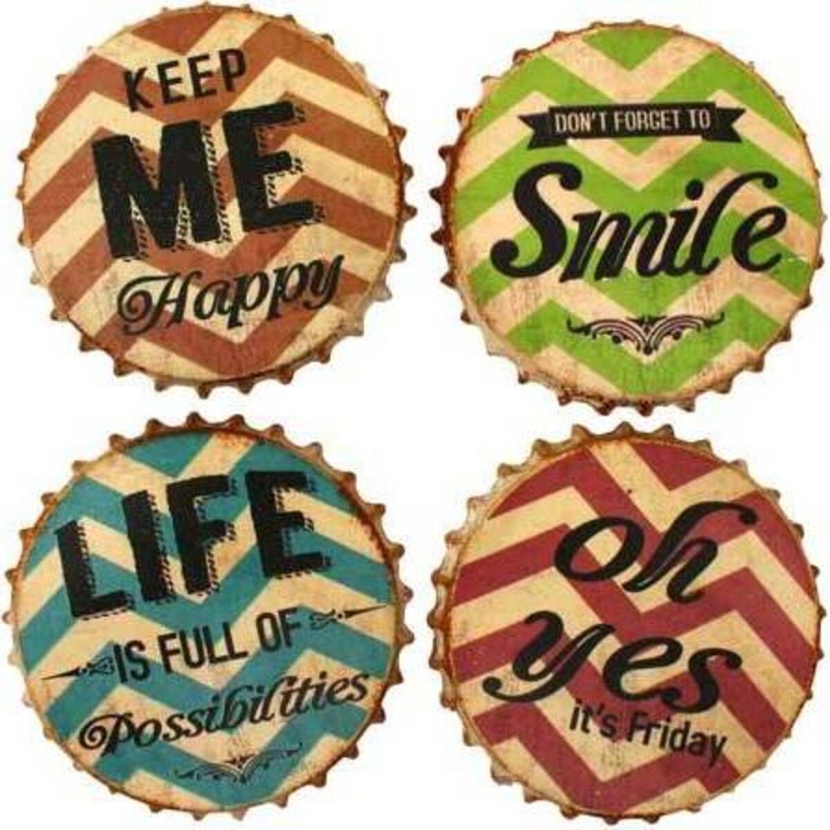 There are four different coasters in this set, and each features a background chevron pattern in a different colour - brown, green, red, and blue - as well as sayings in black wording. One says "Oh yes it's Friday," another says, "Don't forget to smile," a third says, "Life is full of possibilities," and the last says, "Keep me happy." Each coaster features crimped edging that's accented with brown. Give these coasters to yourself or to a loved one who could use a little reminder that it's okay to smile even on the worst of days.